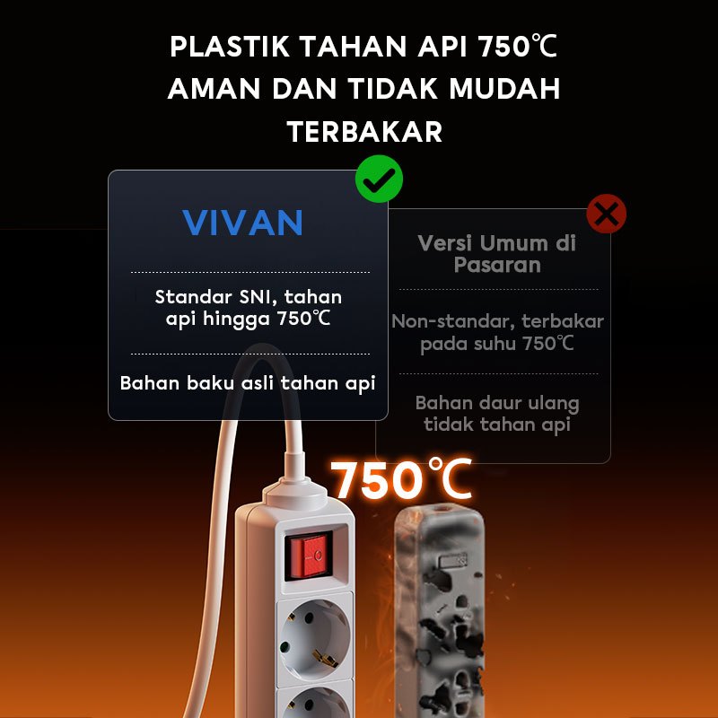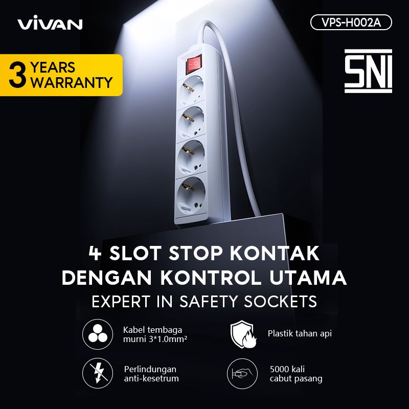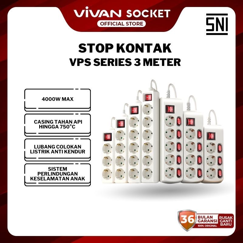 VIVAN Safety Socket VPS Series Stop Kontak Saklar 3 - 6 Kabel Inti Tembaga Murni Plastik Tahan Api Child Lock 3 Met
