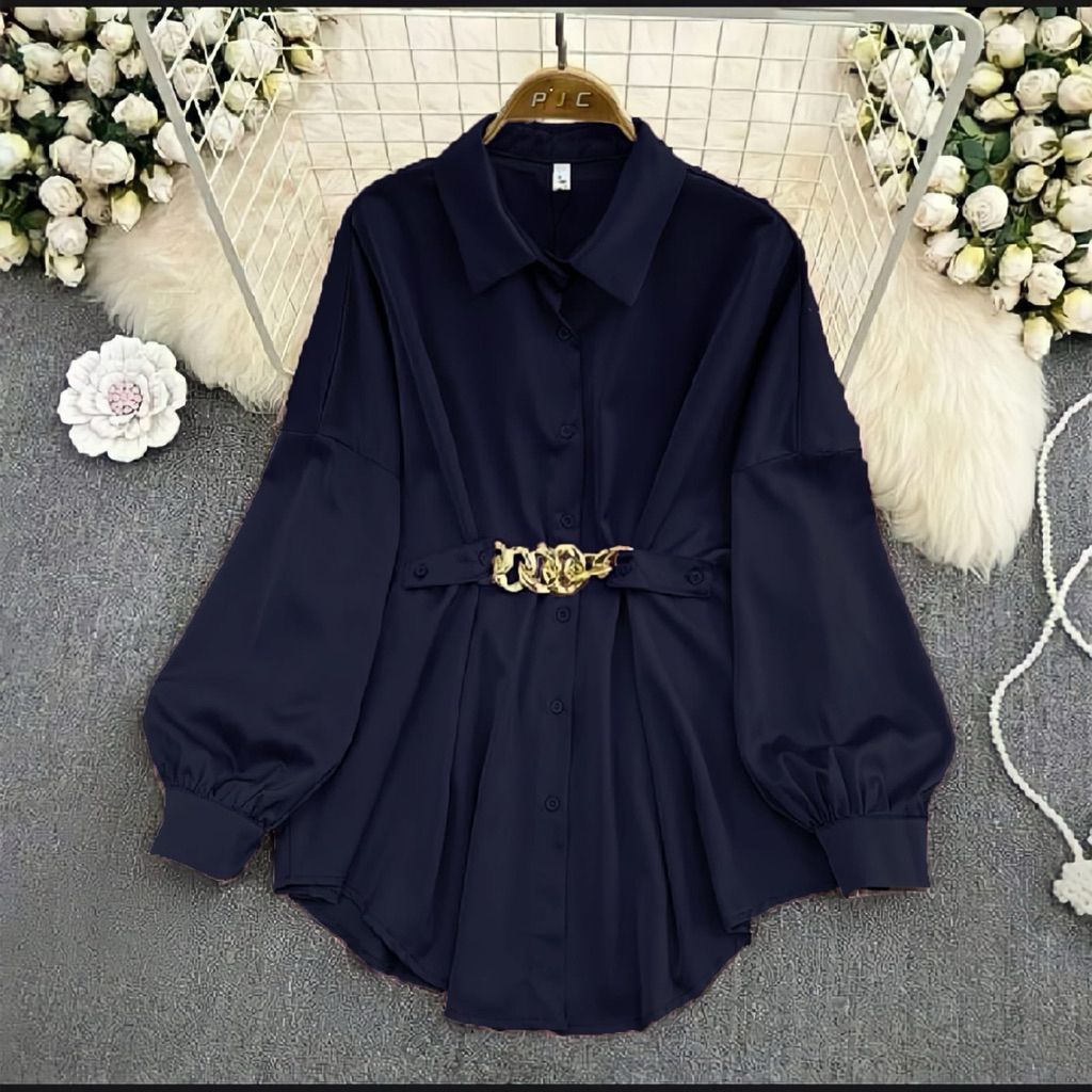 Kemeja Blouse Atasan Wanita Kerja Santai || el Sabuk Rantai Lengan Panjang Bahan Crinkle Airflow