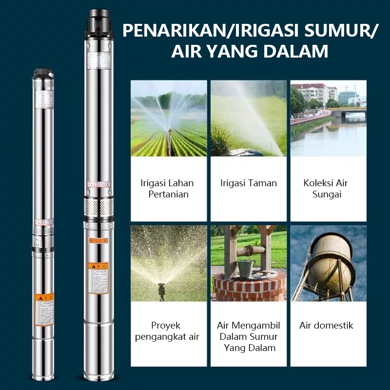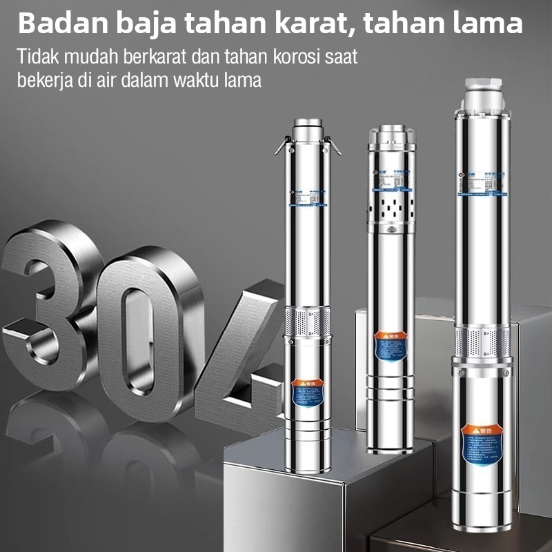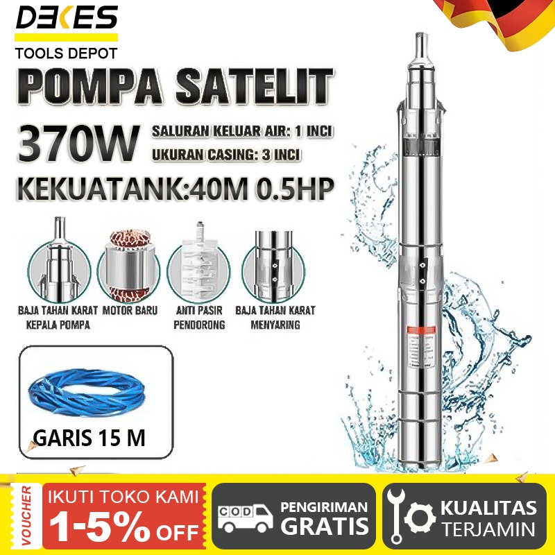 DEKES Pompa Satelit 370W 0.5HP Sawah Kebun Pompa Submersible 3 inch Kabel 15M Stainless Steel Submersible Pump Daya His