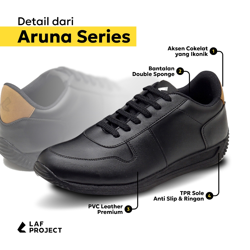 Sepatu Sneakers Pria Hitam Polos Casual Kerja Kantor Keren Original Premium Aruna LAF Project