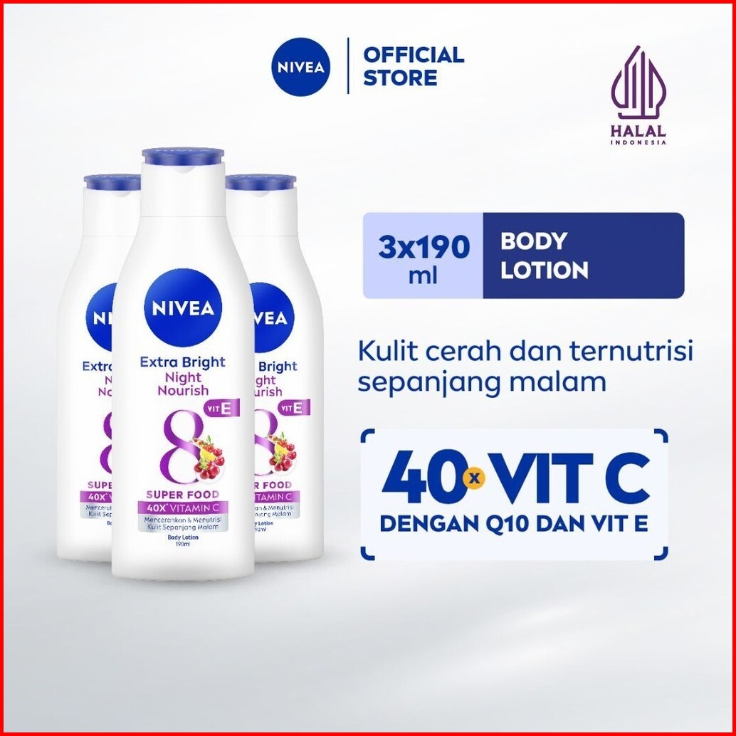 Paket Hemat Isi 3 Nivea Body Lotion Extra Bright Night Nourish Vit E 190ml - Hand Body Lotion Moisturizer Mencerahkan Ku