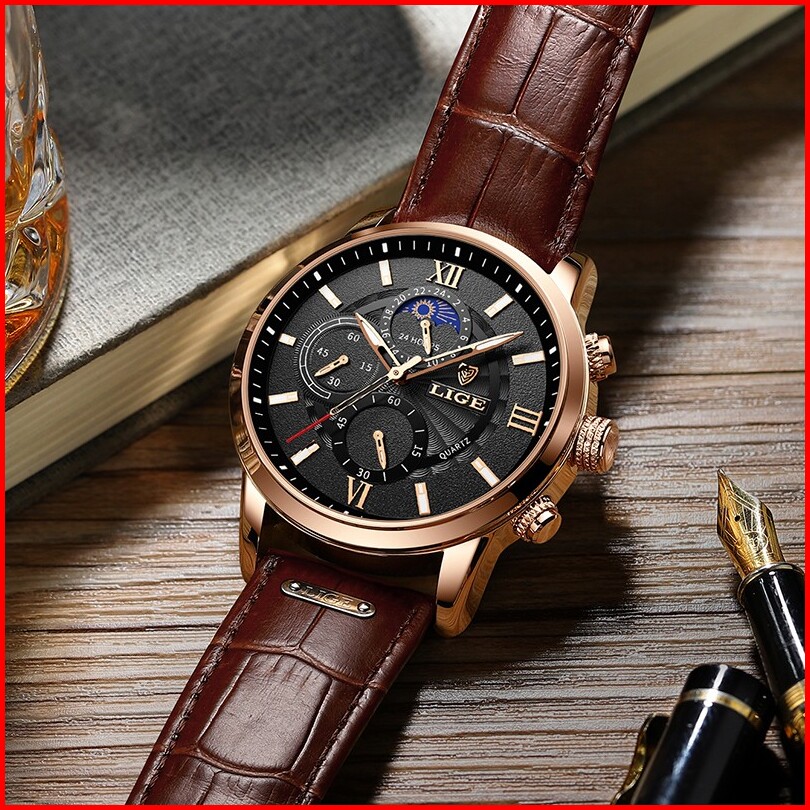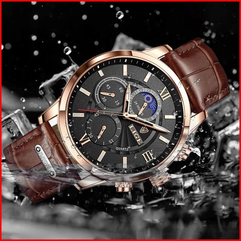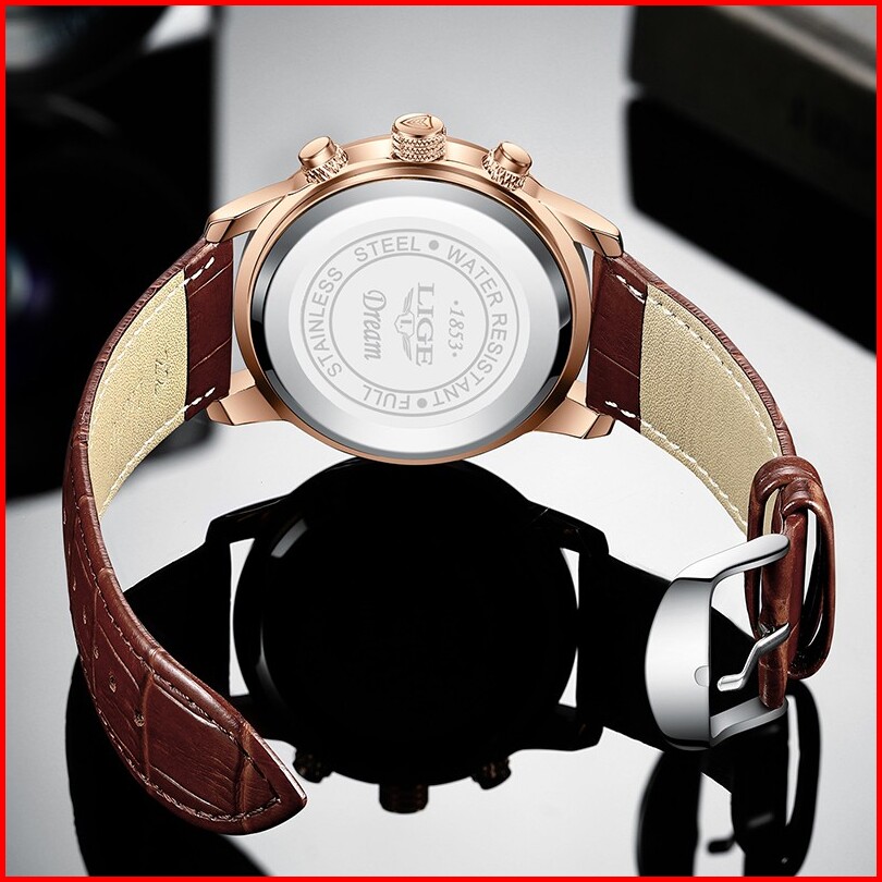 Lige Original Jam Tangan Pria Tali Kulit Anti Air Olahraga Kronograf Jam Tangan