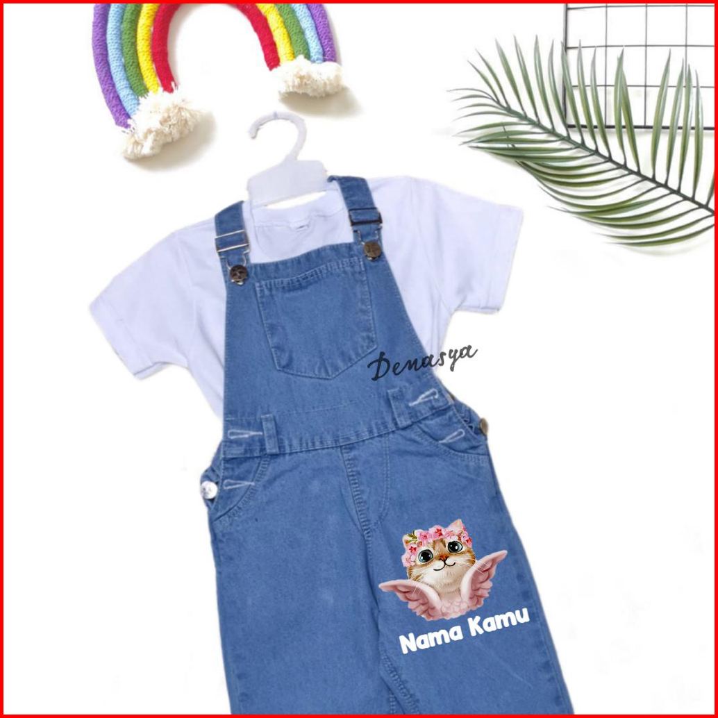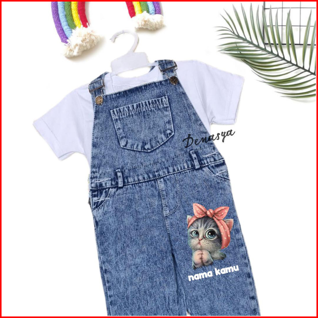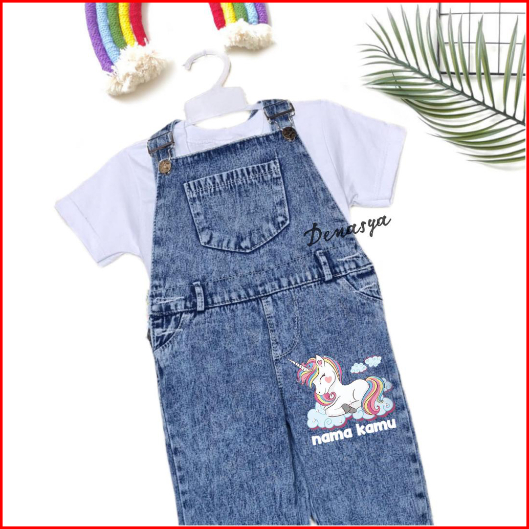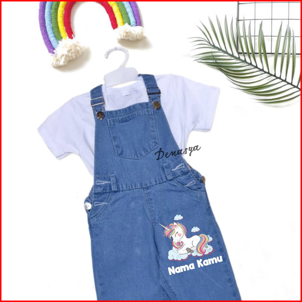 Setelan Anak Perempuan Overall Jeans Anak Motif Sablon Custom Nama Jumpsuit Jeans Anak 1-7 Tahun