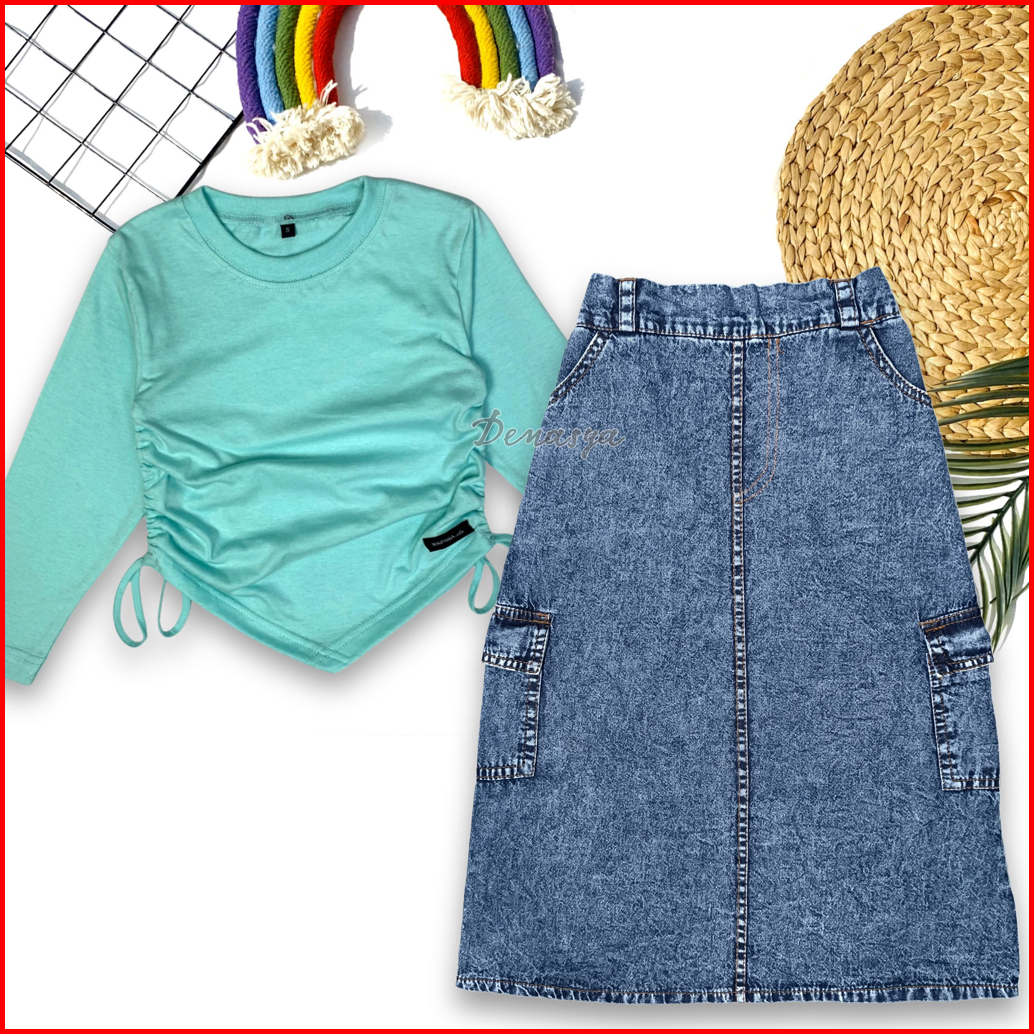 Fashion Style Anak Perempuan Setelan Rok Panjang Cargo Jeans Snowblue Kaos Croptop Serut Usia 2-12 Tahun
