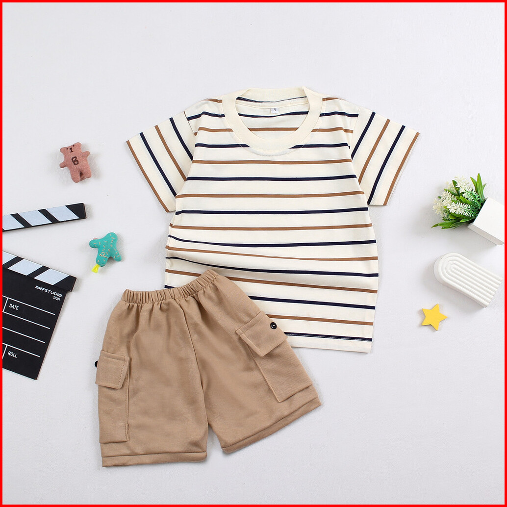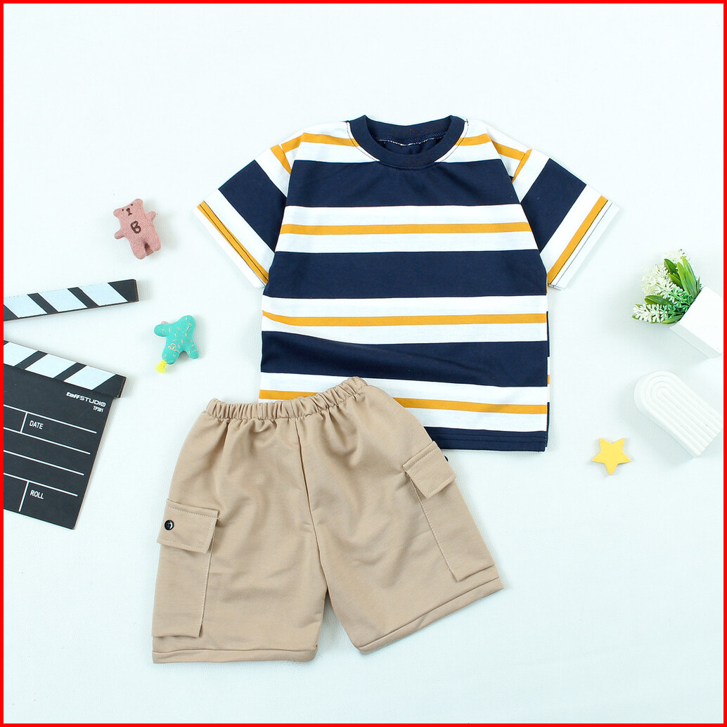 Setelan Anak Kaos Salur Dan Celana Cargo Stik Balik