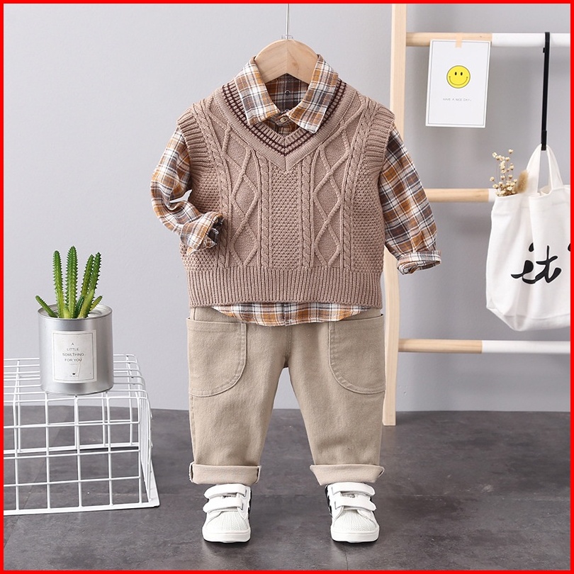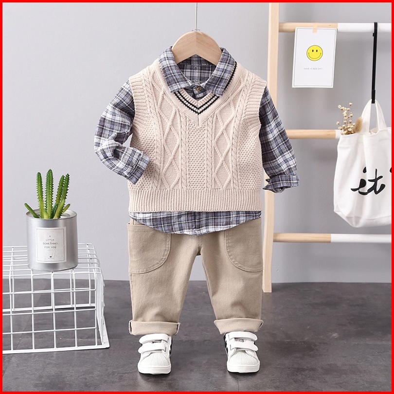 Babybeans - Stelan Bayi Motif St24 Setelan Bayi Laki-laki Setelan Anak Set 3pcs Vest Kemeja Celana Set Boy Baju Import B