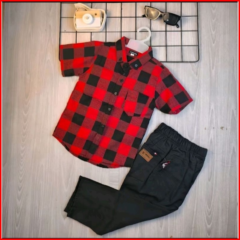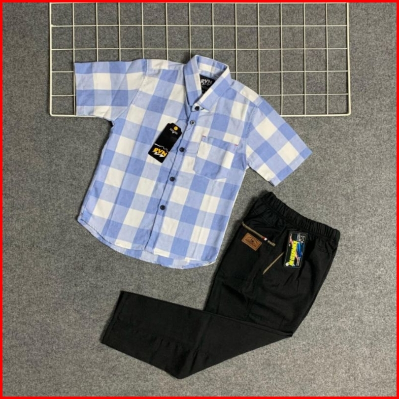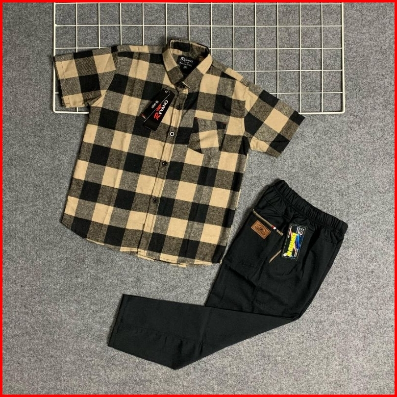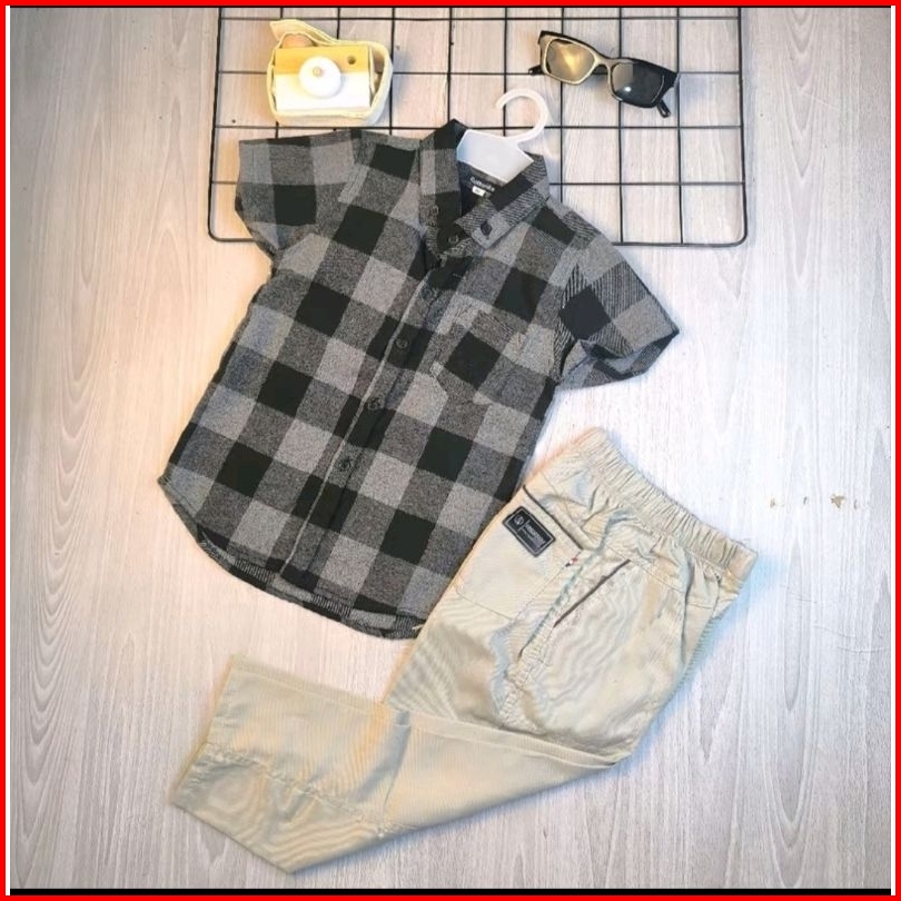 Setelan Kemeja Flanel Anak 3-14 Tahun Kemeja Flanel Lengan Pendek Anak Premium Celana Chino Set Atasan Baju Anak Kemeja