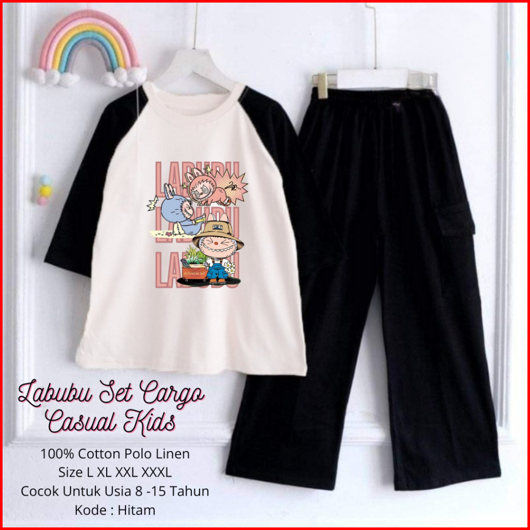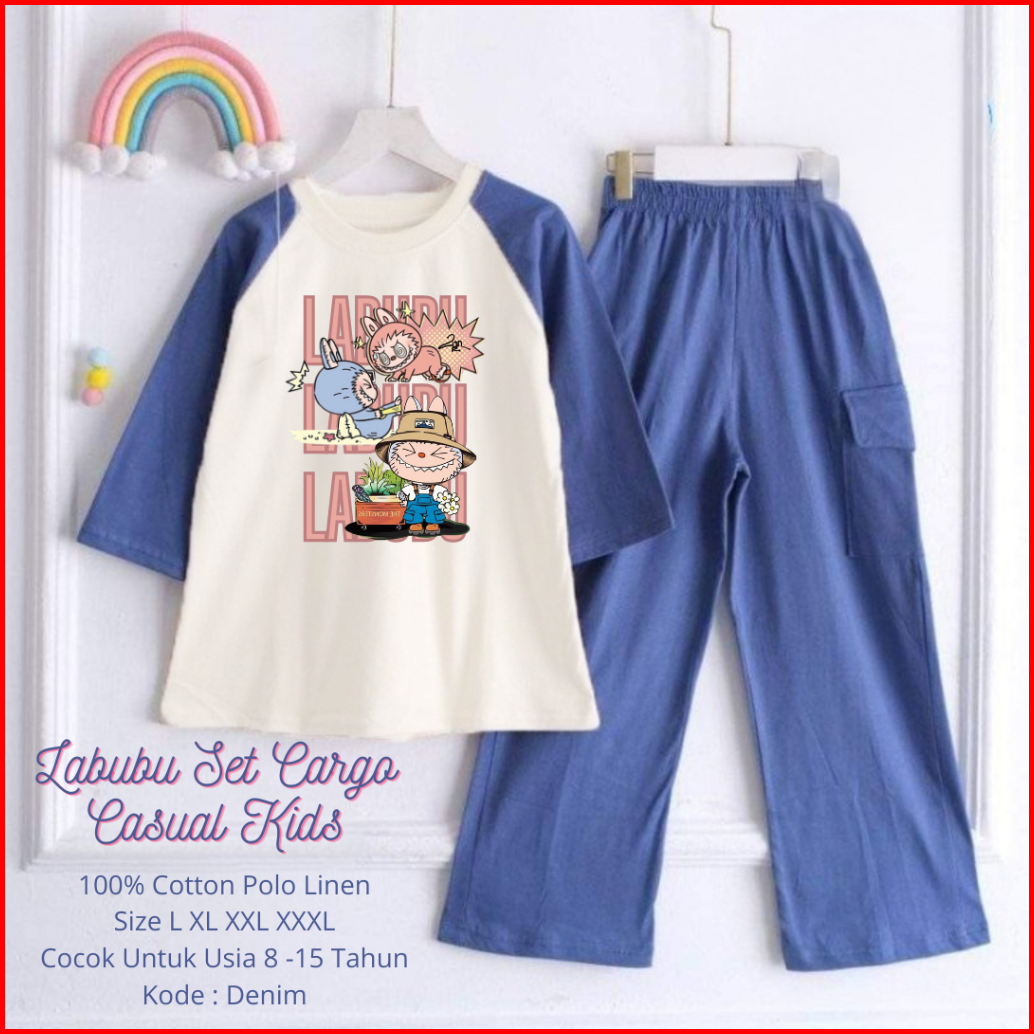 Setelan Anak Perempuan Labubu Set Cargo Kids 100 Cotton Polo Linen Usia 7 Sampai 15 Tahun Viral Hits Terbaru Motif Anoma