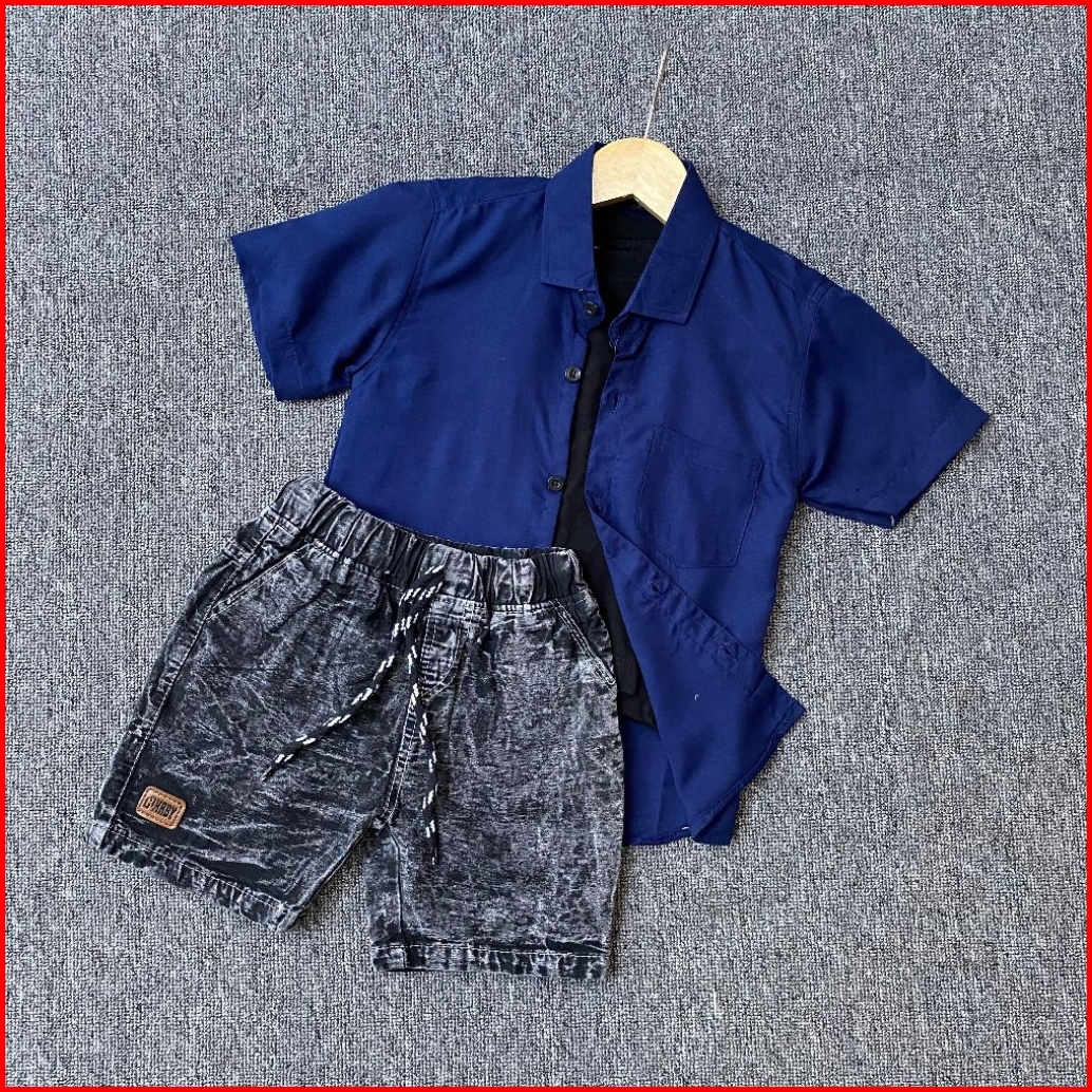 Setelan Anak Laki Laki Kemeja Polos Celana Denim Broadshort Usia 1 - 5 Tahun
