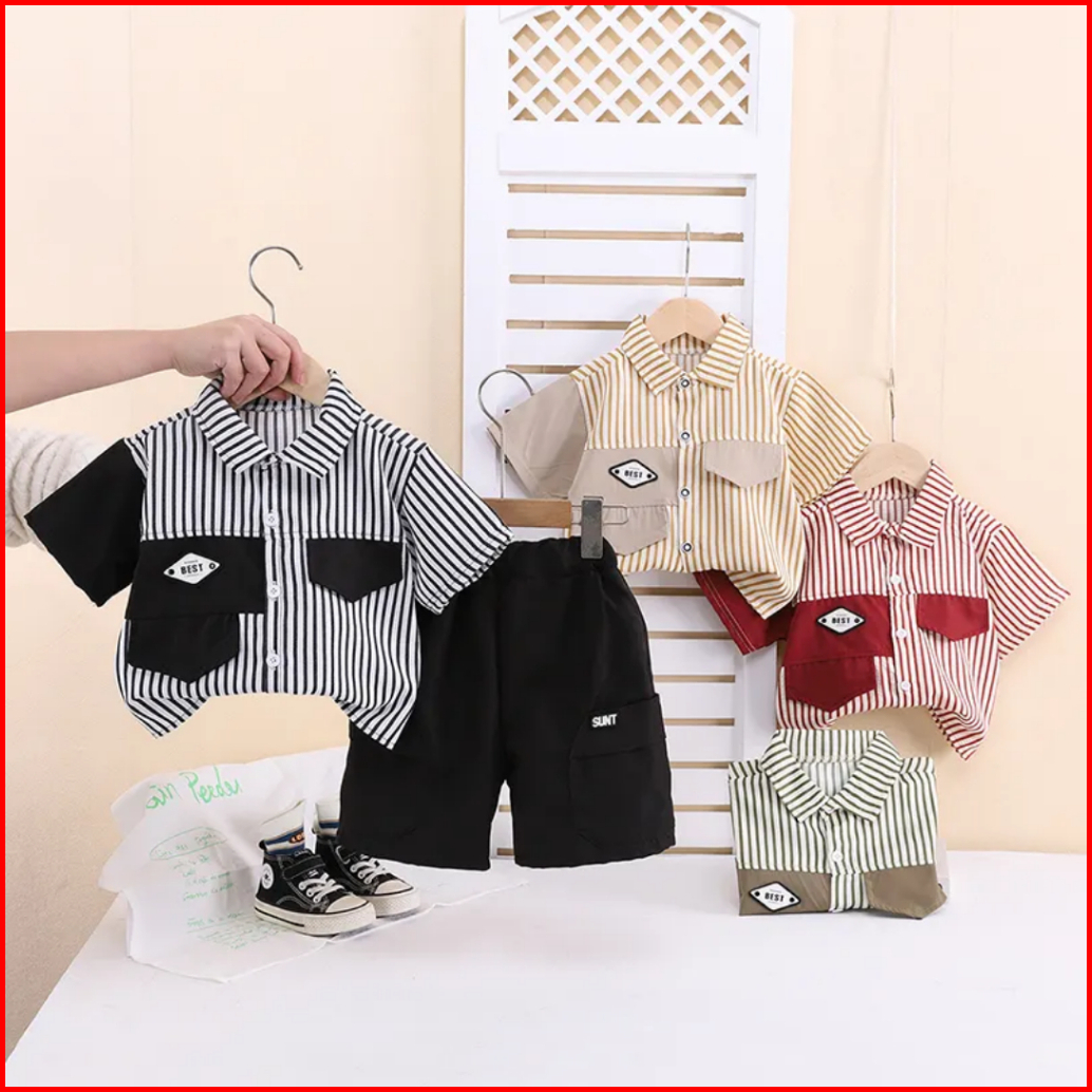 Setelan Kemeja Kombinasi Anak Laki Laki Celana Pendek Cargo 1-6 Tahun