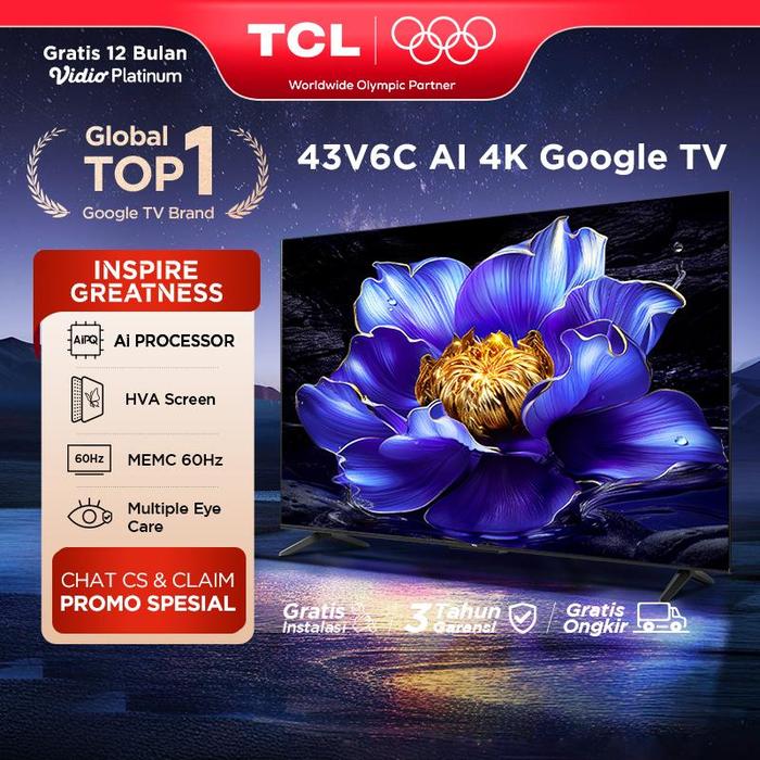 TCL AI 4K Google TV 43 inch V6C - MEMC - HDR 10 - HVA Panel - Dolby Audio - Google Play/Netflix | Smart Android | 43V6C