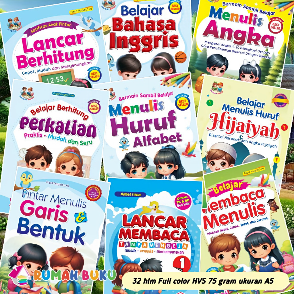 Bljr menulis Huruf, Bljr menulis Angka, Bljr Huruf Hijaiyah, Pintar Berdoa, Lancar membaca 1, Lancar membaca 2, Lancar membaca 3, Lancar membaca 4, Lancar membaca 5, Lancar membaca 6, Garis & Bentuk, Membaca & menulis, Lancar berhitung, Bahasa Inggris, Perkalian, Pembagian, Penjumlahan, Pengurangan, Menulis huruf BESAR, Menulis huruf kecil, Aktifitas Tes IQ, Mngsh kcrdsn IQanak, CALISTUNG 1, CALISTUNG 2, Teka teki silang 1, Teka teki silang 2, Melipat Origami, Mencari Jejak, Penjumlahan bersusun, Pengurangan Bersusun, Perkalian Bersusun, Pembagian Bersusun, Gunting Tempel Buah, Gunting Tempel Sayur, Gunting Tempel Bunga, Gunting tmpel Bentuk, Gunting transportasi, Gunting H.Peliharaan, Gunting Hewan Liar, Kata & Kalimat, Suku Kata & kata, Hrf Tegak Bersambung