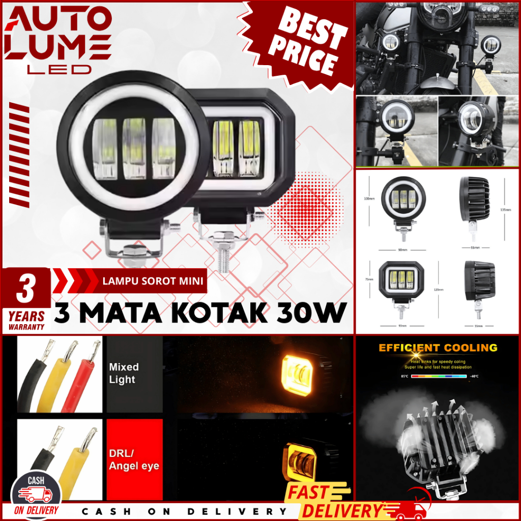 Lampu Tembak OWL 3,5INCH - LAMPU Sorot Daymaker LED Motor Mobil 3.5 Inci 30W 3 Mata - Angel Eye 6D, Bulat & Kotak