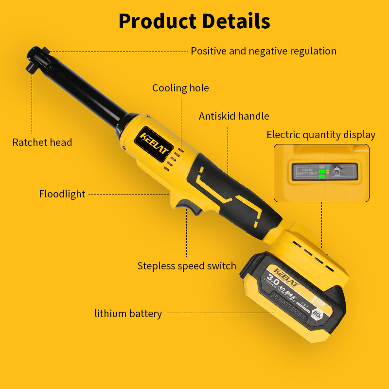 【KEELAT-KRW003】 Motor Brushless 60N.M 3/8 Inci Kunci Rachet Nirkabel Kepala Panjang 16CM Kunci Listrik Alat Bertenaga