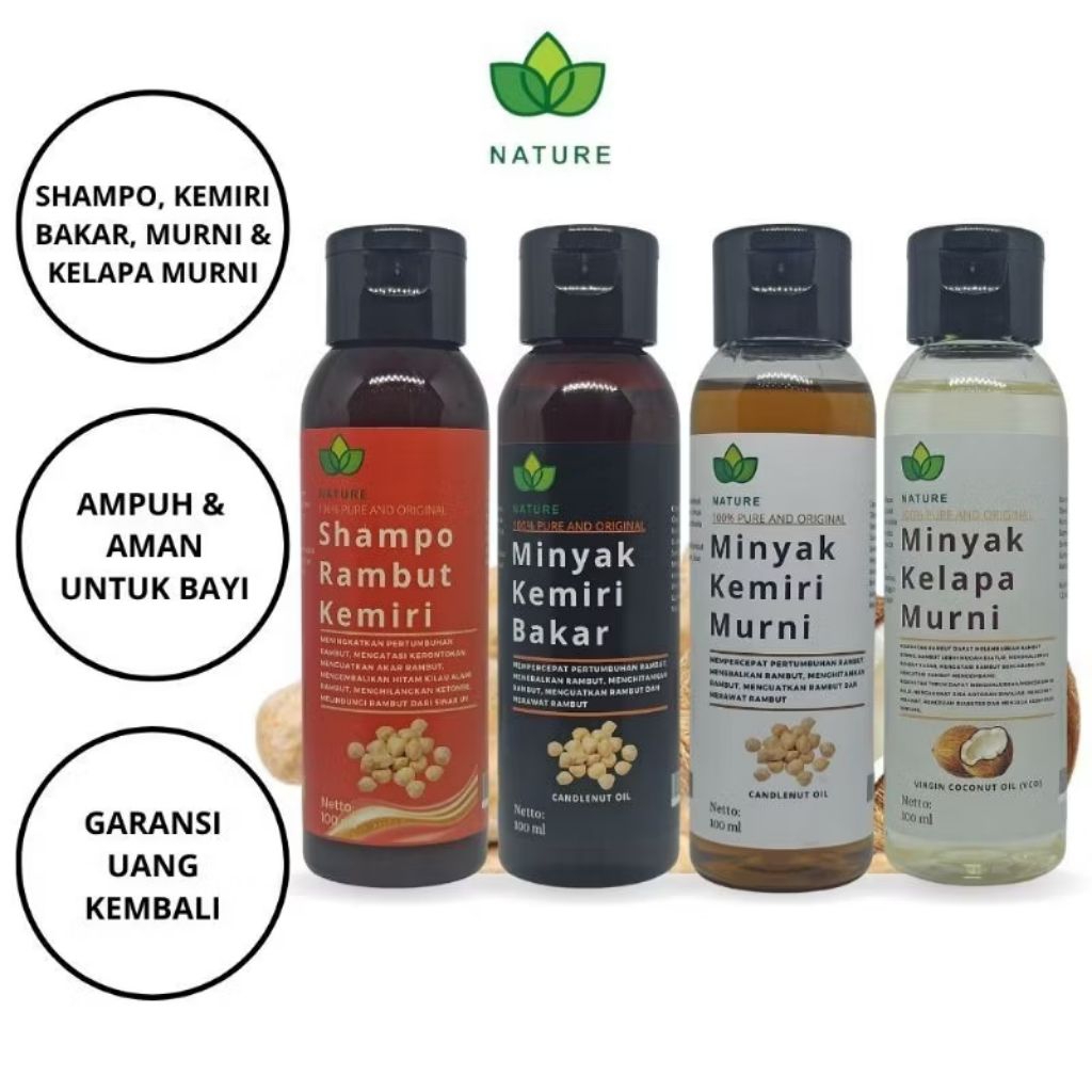 PAKET KOMBO HEMAT 4 PCS Minyak Kemiri Bakar+Minyak Kemiri Murni+Minyak Kelapa Murni+Shampo Rambut Kemiri Nature 100 PERSEN Asl