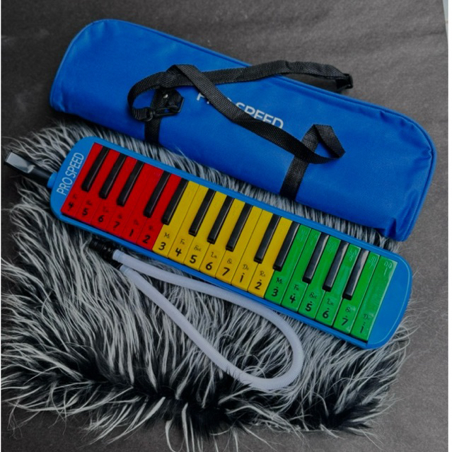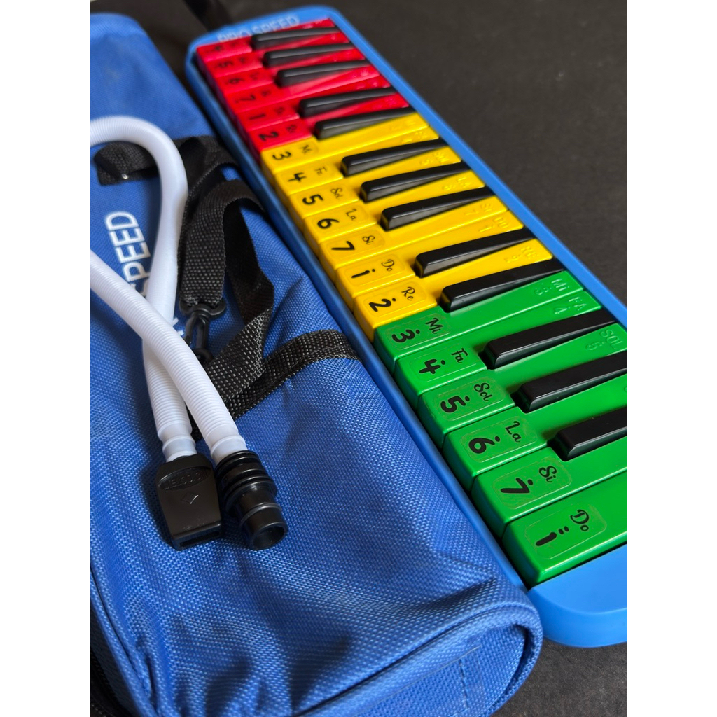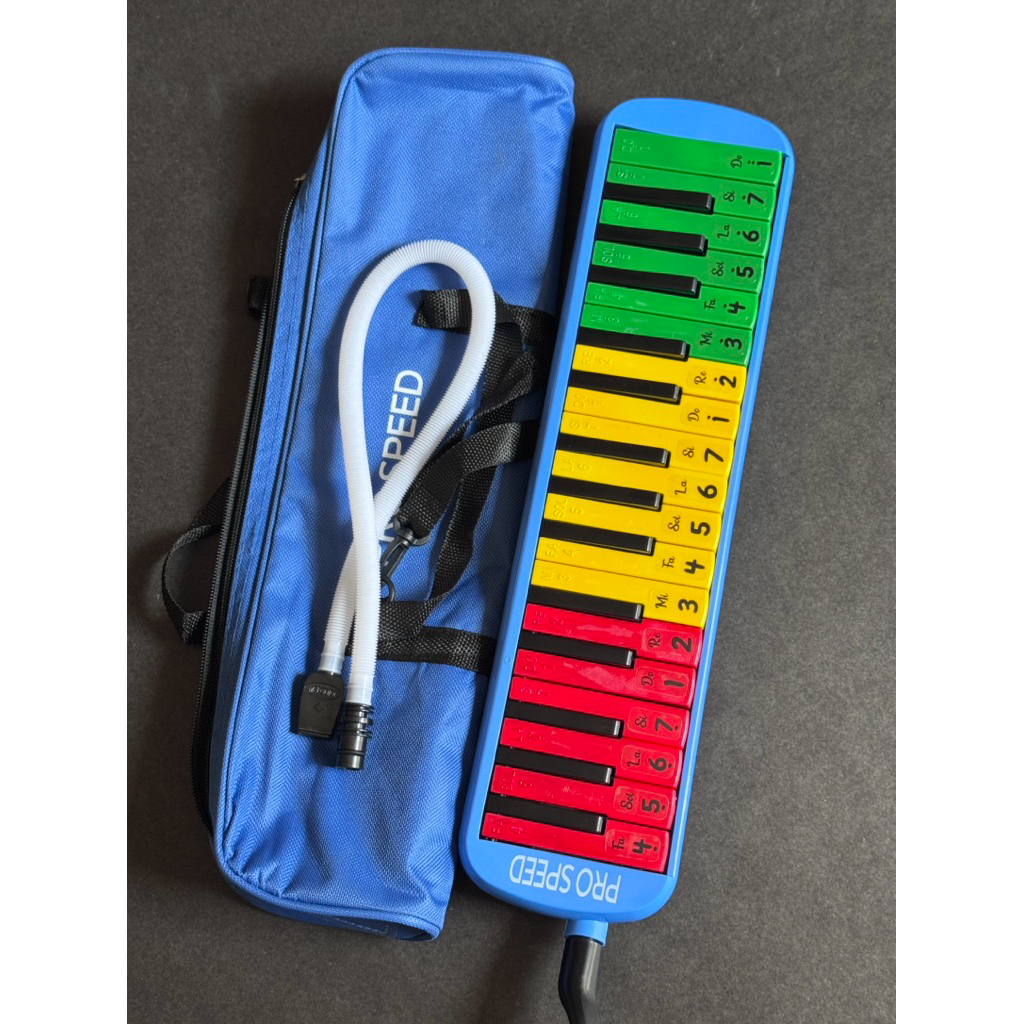 PIANIKA MERAH KUNING HIJAU 32 KEY TAS COVER WARNA BIRU DAN SELANG PENIUP