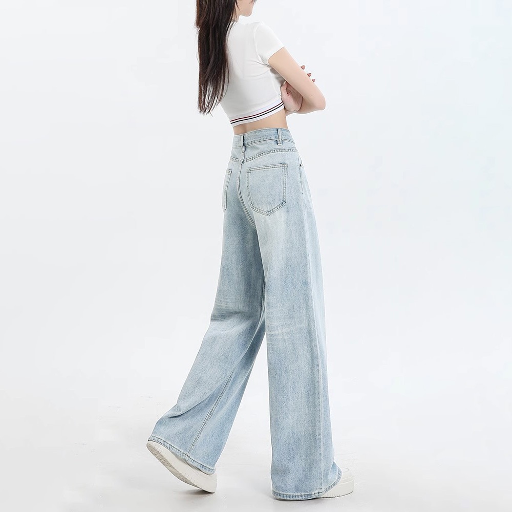 Loyka Celana denim berwarna terang berkaki lebar untuk wanita celana lurus ramping longgar pinggang tinggi celana panjang lantai 2025 baru