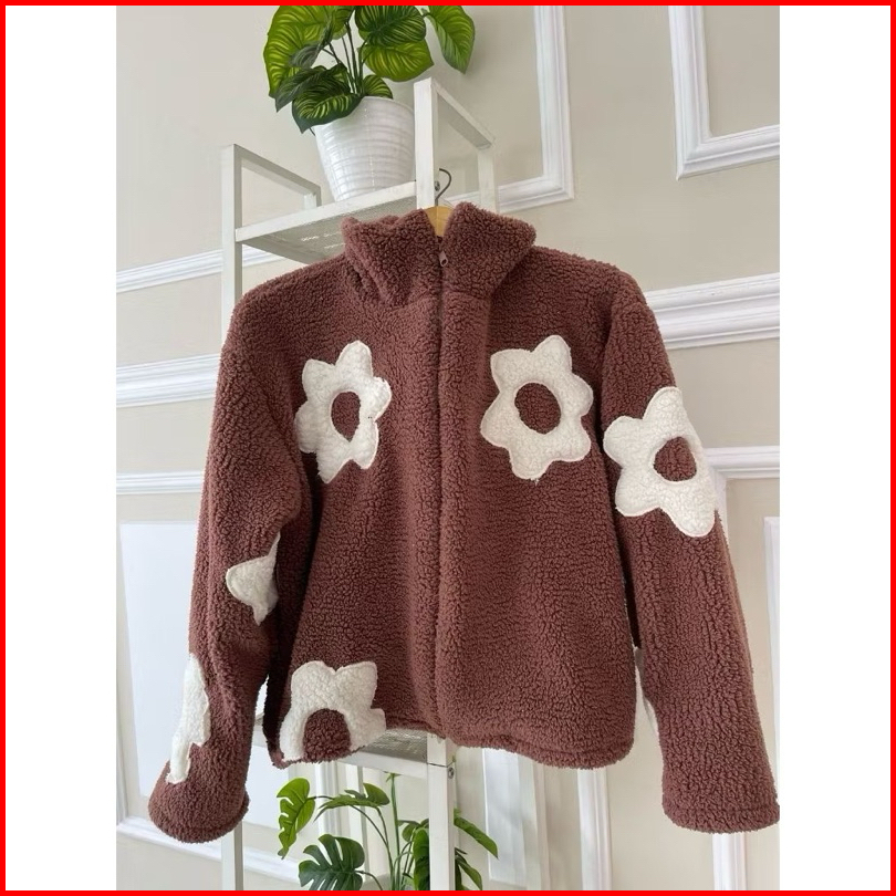 Jaket Sherpa Bulu Wanita Crop Flower Sweater Zipper