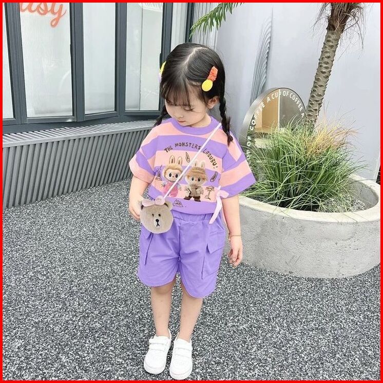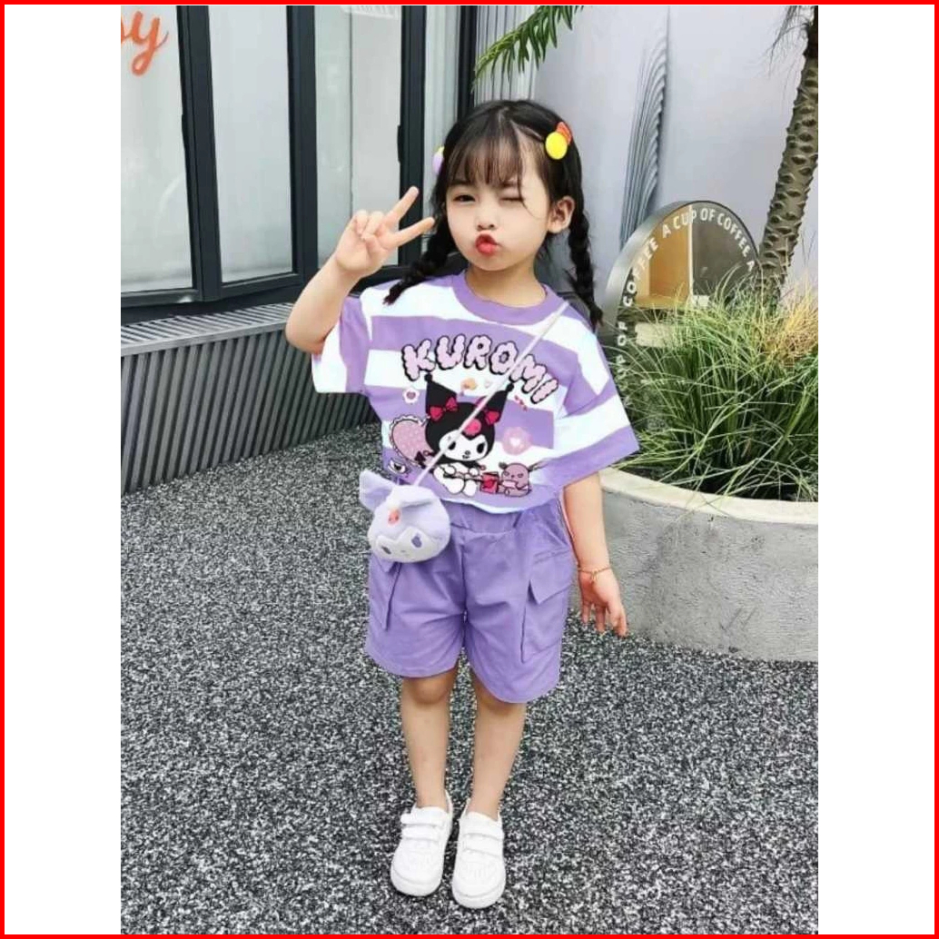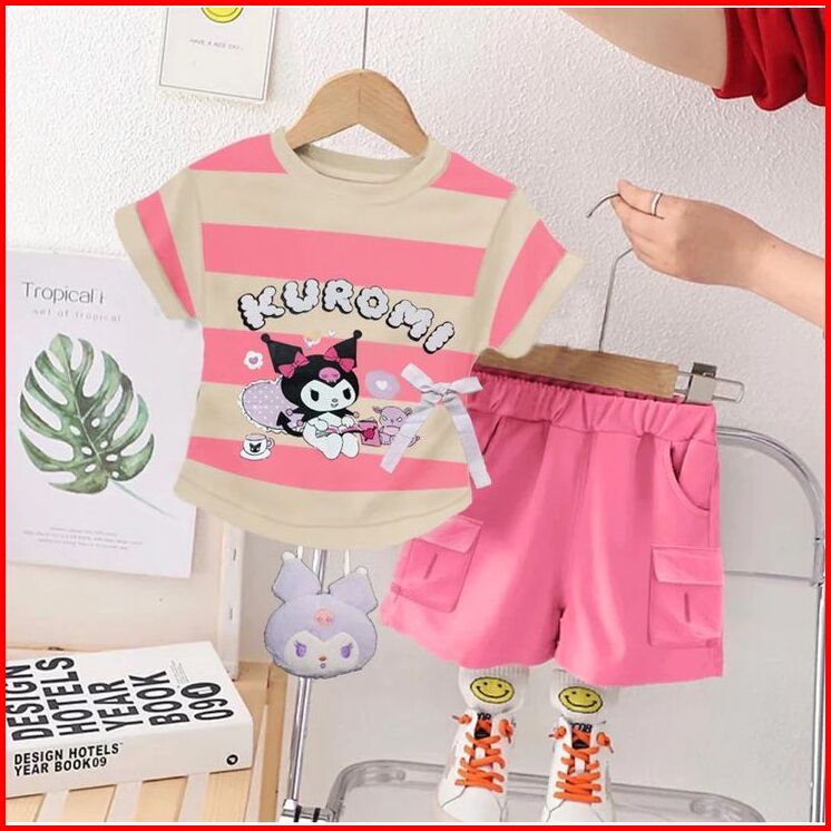 Baju Setelan Anak Perempuan Setelan Kaos Celana Cargo Pendek Karakter Kuromi Usia 1-5 Tahun