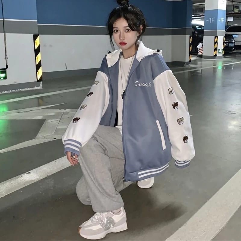Femes Dairsk Bear Ziper Hoodie Outerwear Wanita Remaja Matt Fleece Sablon Tebal Premium OOTD Korean Style
