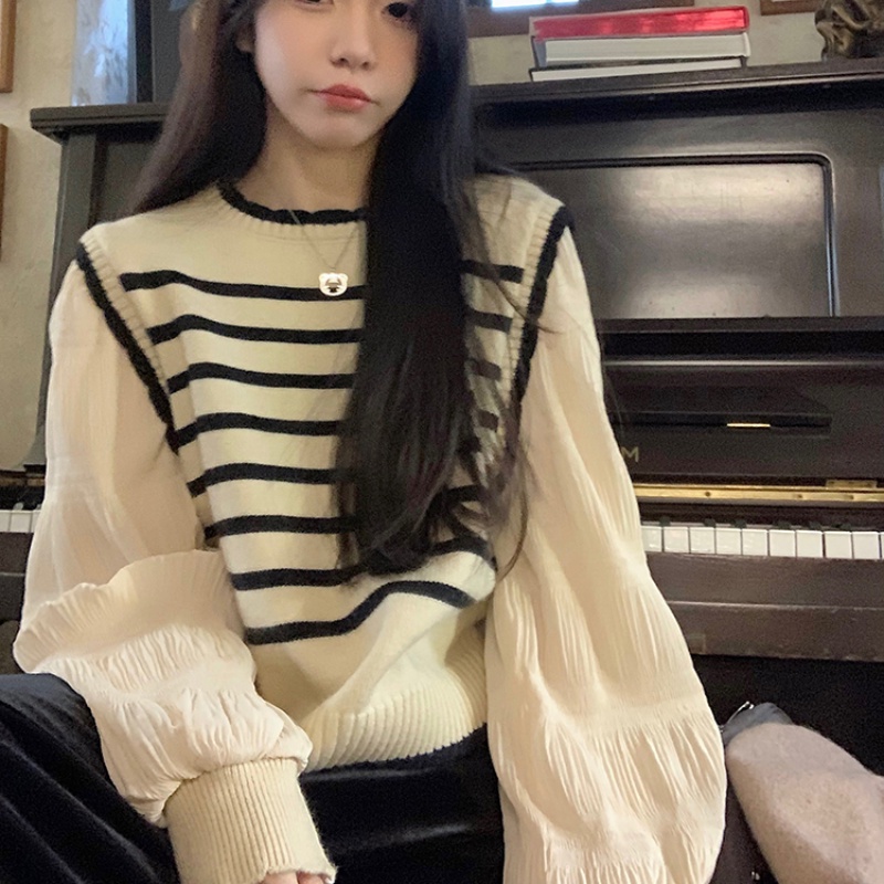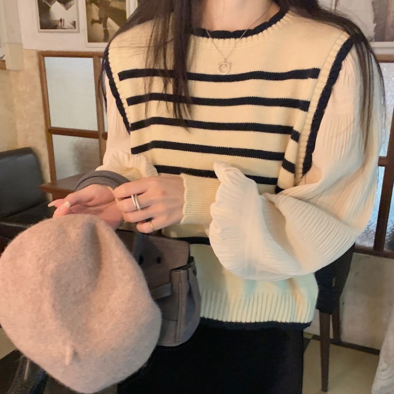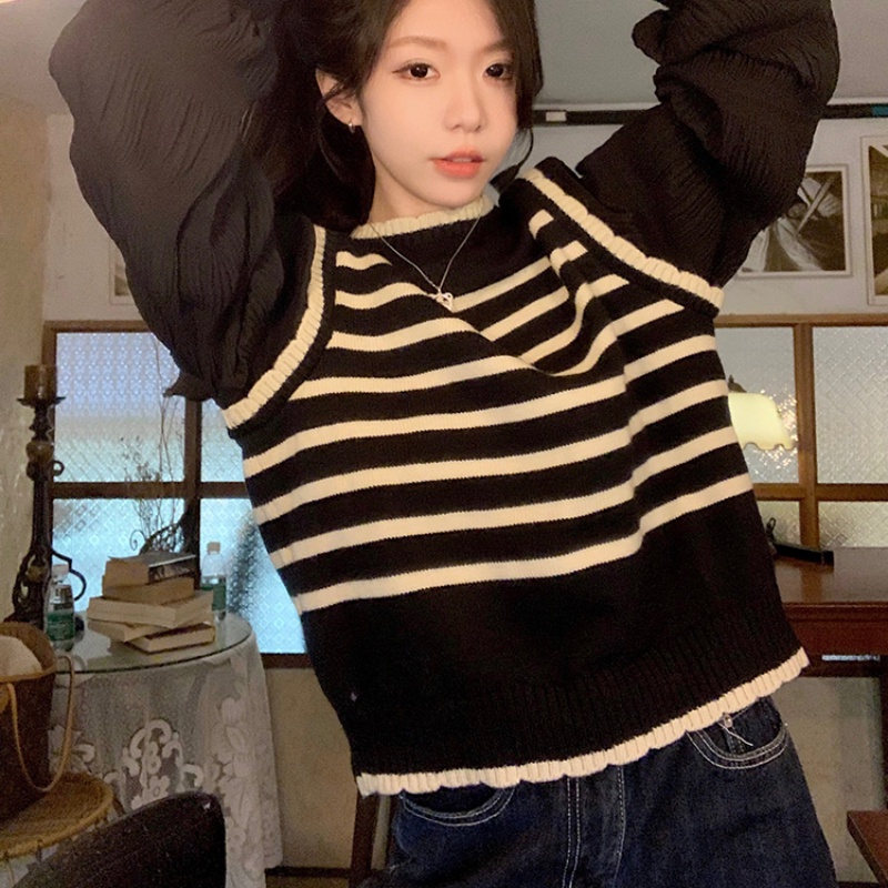 YURUMA Korea jahitan bergaris palsu dua potong sweater rajut wanita atasan pendek longgar