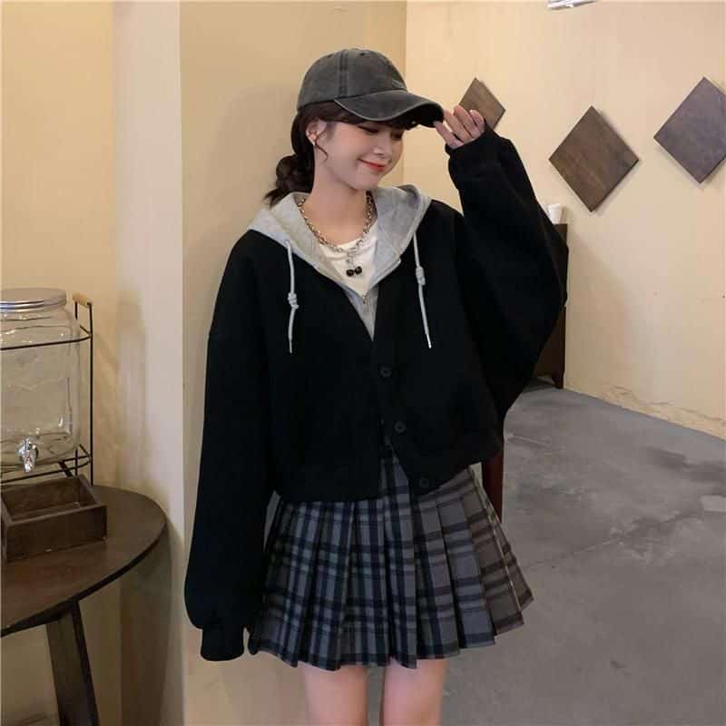Femes Zip Combie Button Jaket Outerwear Twotone Ziper Wanita Remaja OOTD Korean Style