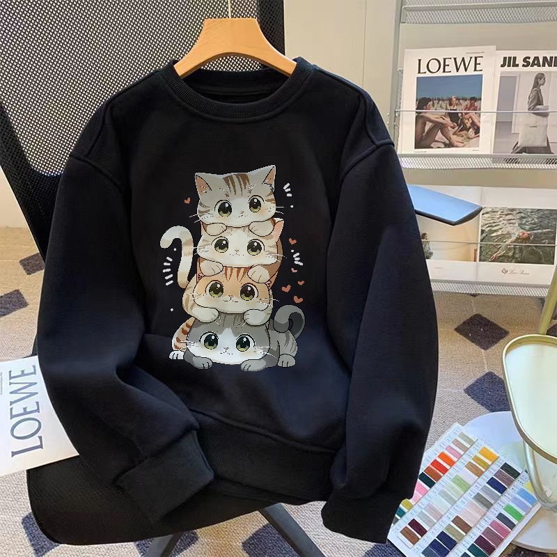 Forteid Sweater Besar Gaya Jalanan Korea/Sweater Besar Lucu untuk Wanita Kaus Hitam Sweater Karakter Kucing lucu Sweater Besar Korea Wanita Leher Bulat Gadis Sweater Besar Estetika