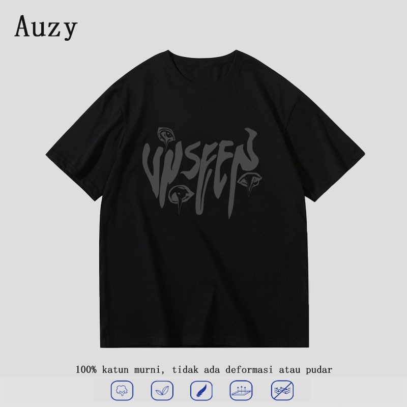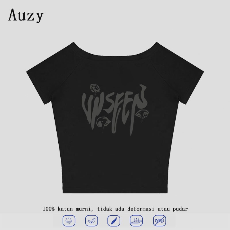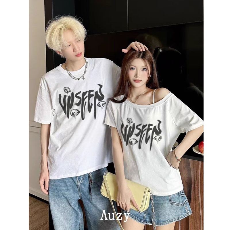 AUZY Wseep Gaya Amerika surat Coretan pencetakan Pasangan Atasan tanpa bahu kaos pria wanita atasan Lengan Pendek T-shirt skena baju oversize t shirt 7.30