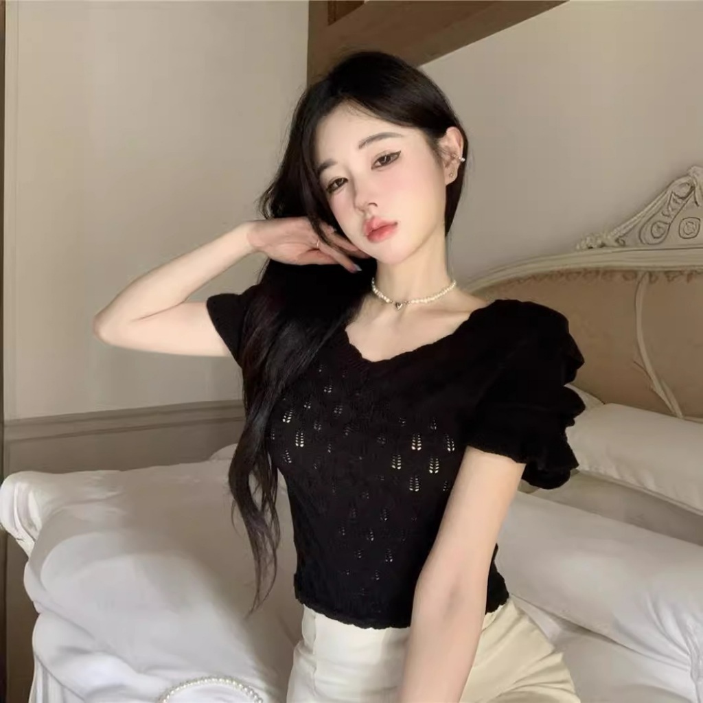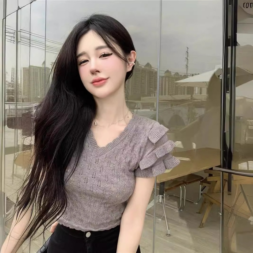 Atasan Wanita Korea Style Lengan Double Ruffle Vneck Knit Terbaru | Baju Wanita Crop Top Jaring Jaring Halus Terbaru | A