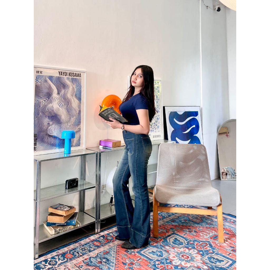 Highwaist Cutbray Jeans Stretch Wanita Retro Vintage Lipat Bawah Flare Panjang