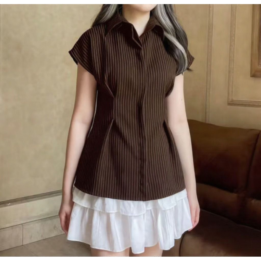 ELOURA - Kemeja Wanita Salur Alba Top - Stripe Fitted Lengan Pendek Casual