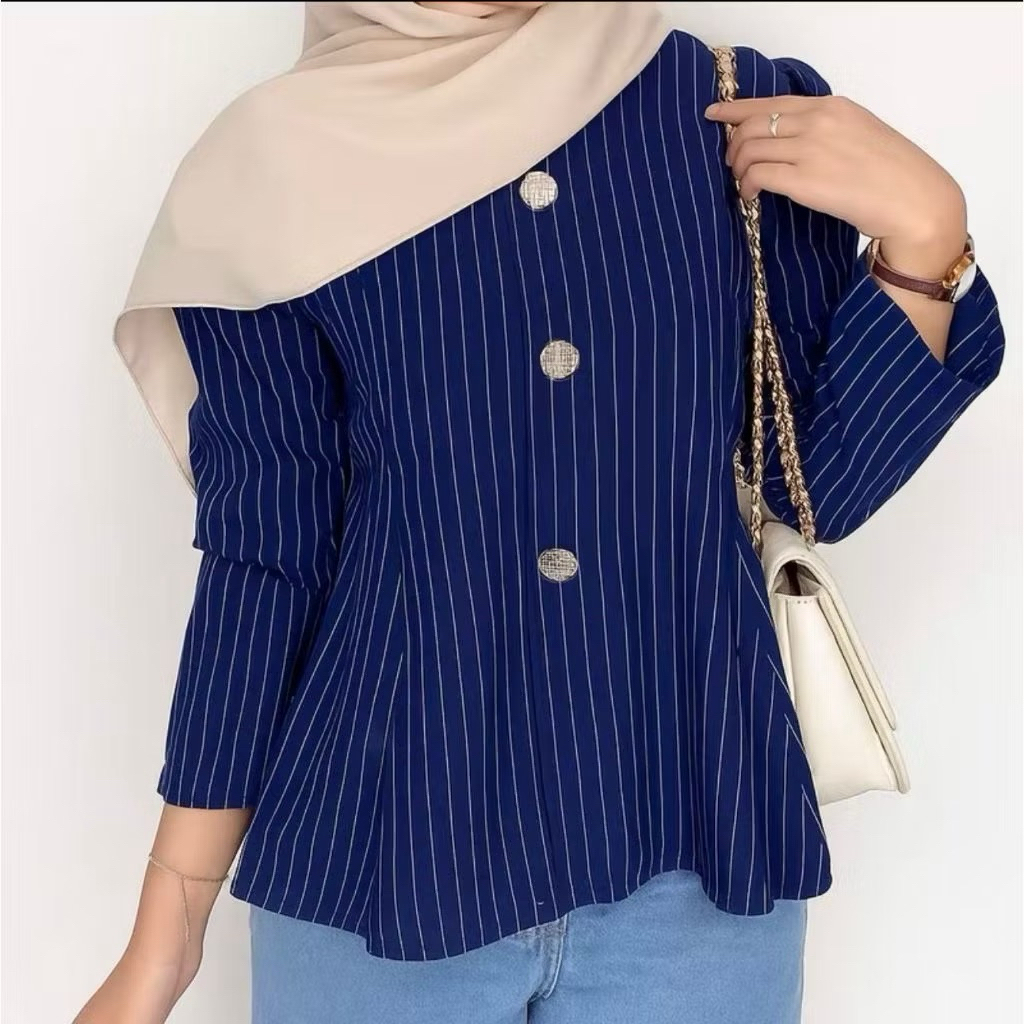 Arika Blouse Stripe Atasan Peplum Wanita Salur Lengan Puff Fit Body Fitted-Atasan Wanita Kekinian