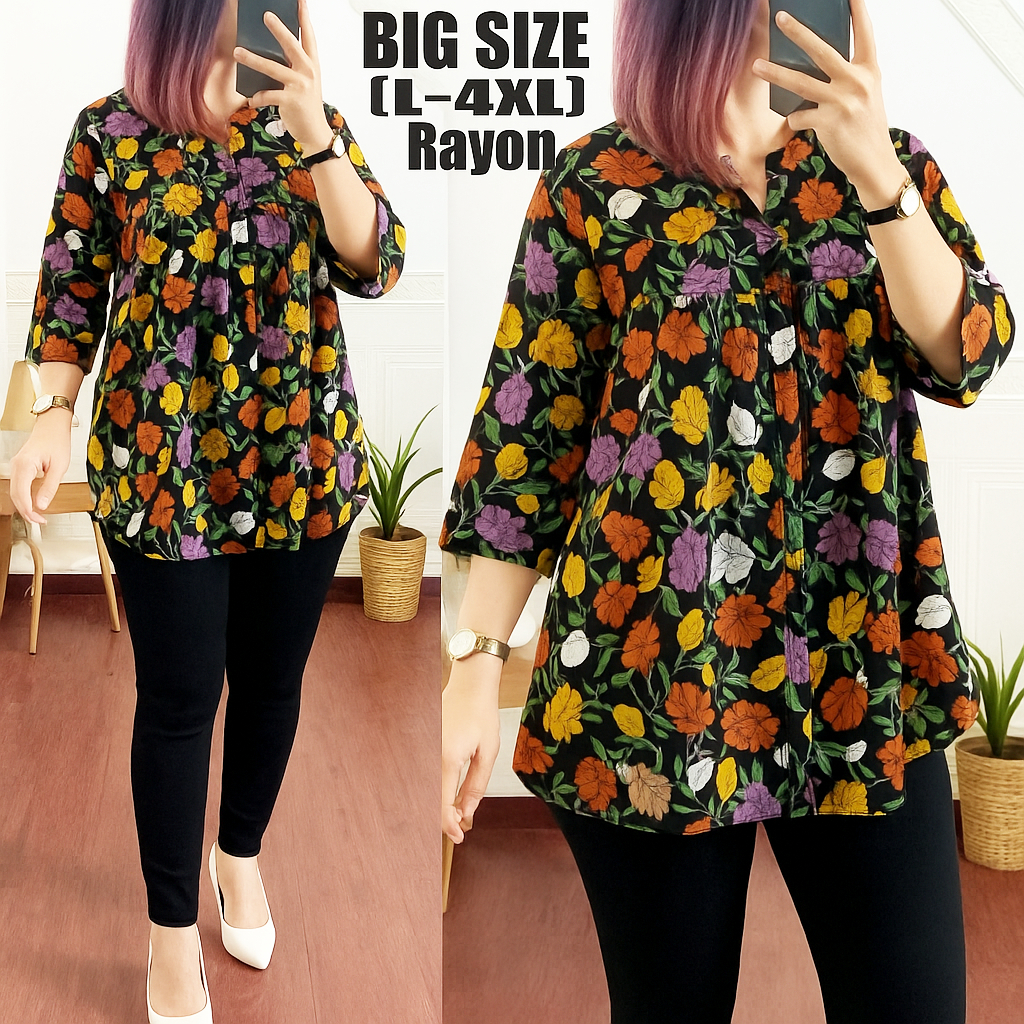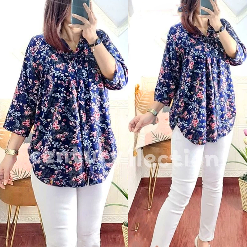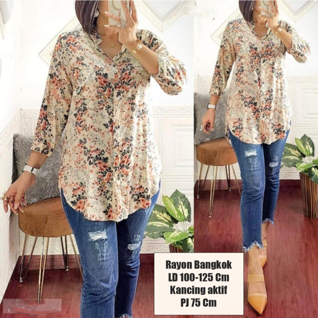kemeja wanita jumbo motif bunga rayon lengan panjang 7/8 terbaru 2024