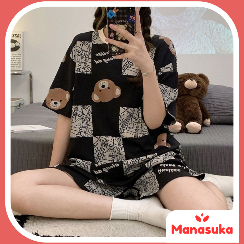 MS Baju tidur wanita setelan piyama lengan dan celana pendek motif karakter kartun lucu bahan katun kaos lembut korea st