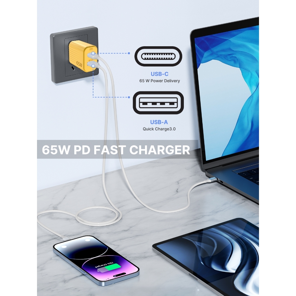 Aioneus | Kepala Charger Fast Charging 65w USB+Type c Dual Ports Support All Fast-Charging Quick 4.0 Original Adapter