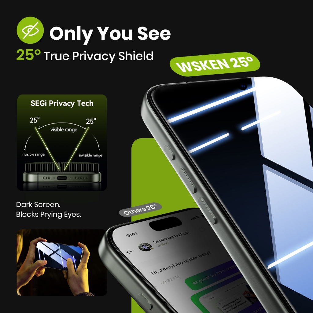 New WSKEN iPhone 17 Pro Max Series Tempered Glass Screen Protector (2-Pack) + Easy-Apply Tool HD Privacy Protection, Oil-Resistant, Anti-Fingerprint