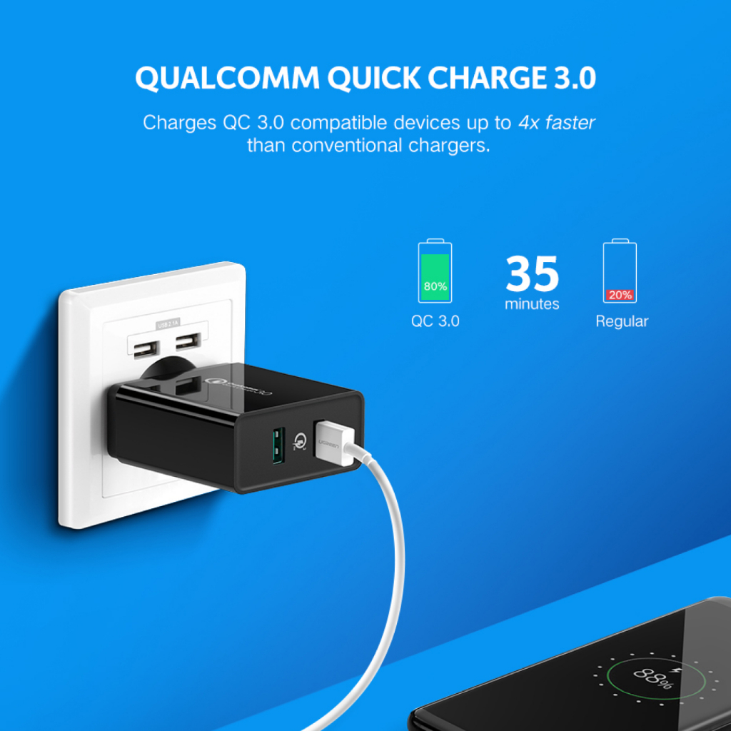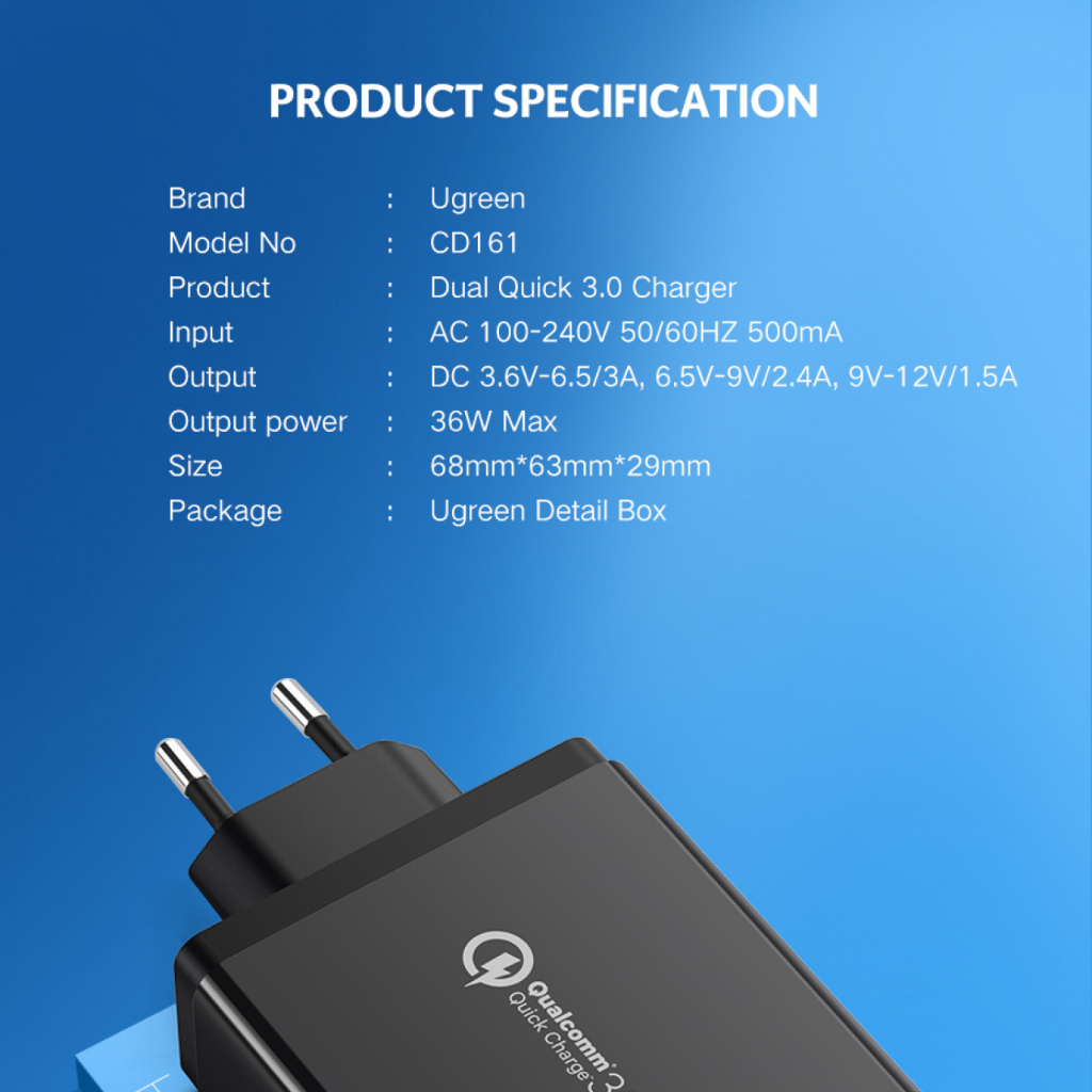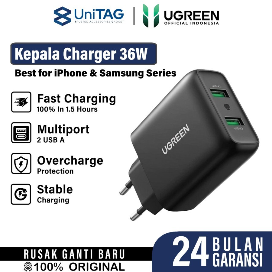 Kepala Charger Samsung Adaptor Dual Port UGREEN 36W QC Fast Charging USB A