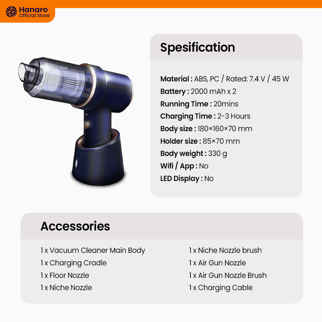Hanaro Mini Vacuum Cleaner Portable LT-117 Penyedot Debu Mobil Karpet dan Kasur 6 in 1 Multi Fungsi Vacuum Cleaner Tanpa