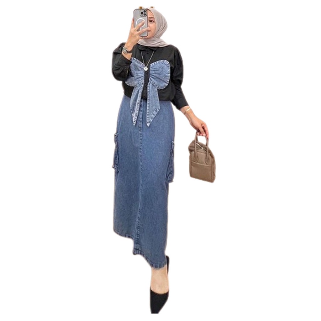 Vallina Outfit - Ribbon One Set Skirt Pita Buffy Jeans Top Toyobo Baju Setelan Rok Wanita Muslim Modern Kekinian Premium