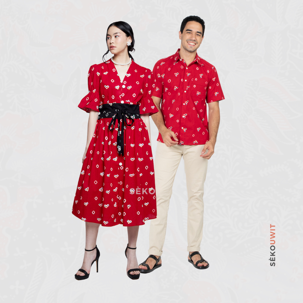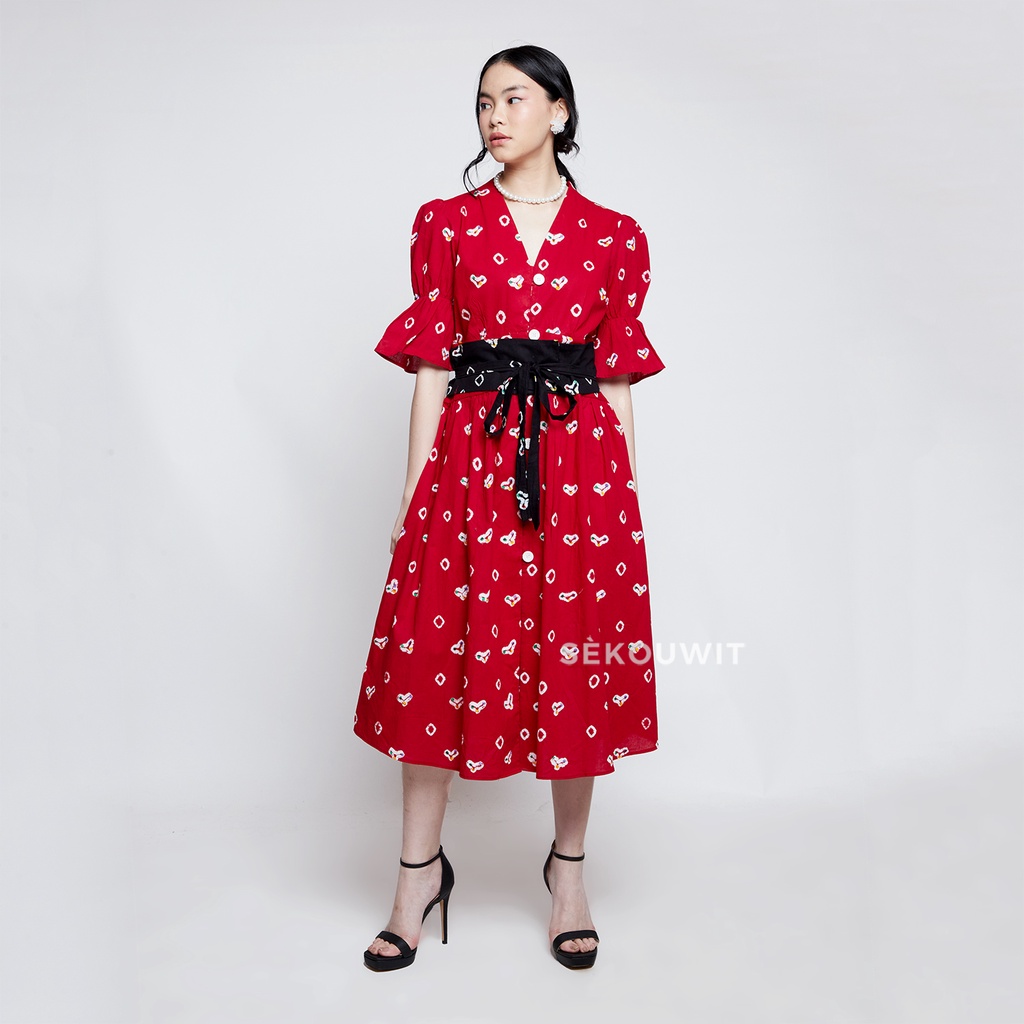 EUGENIA Botton-Down V Neck Midi Dress Batik Jumputan Sèkouwit Red
