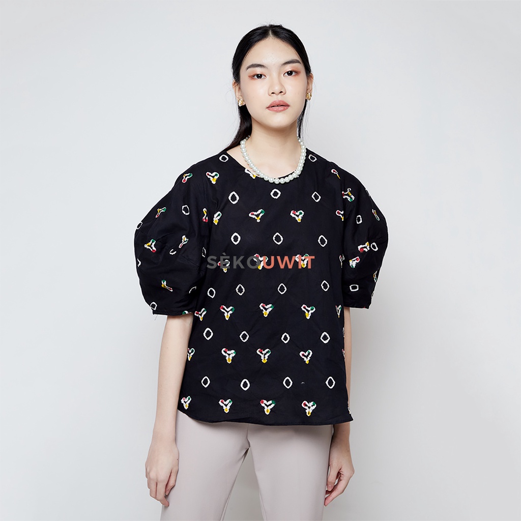 Cali Hand Written Batik Jumputan Lantern Sleeve In Black / Blus Batik Jumputan Sekouwit