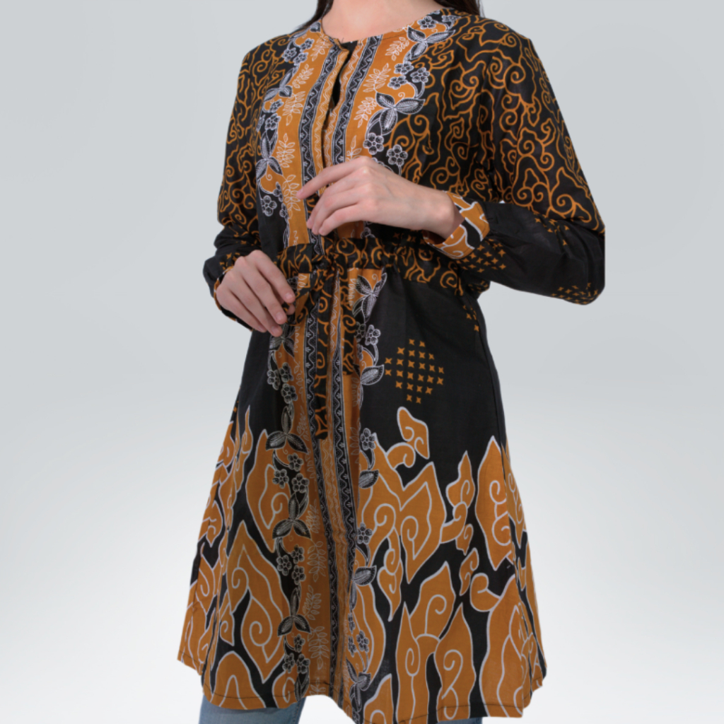 BATIK TRUSMI Set Couple Tunik Batik Wanita Teku dan Kemeja Pria Lengan Panjang LKK Mega Mendung Kuning