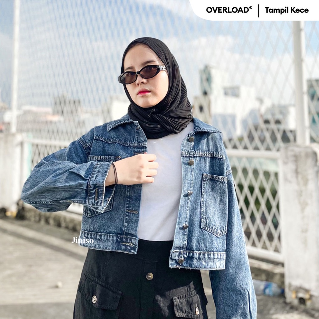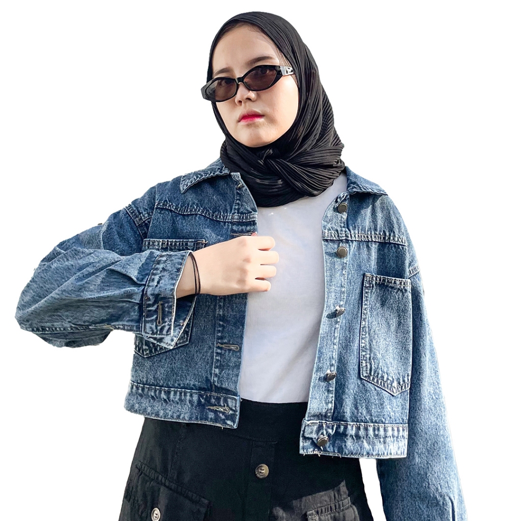 JINISO Jaket Crop Jeans Oversize Pocket Blue Acid