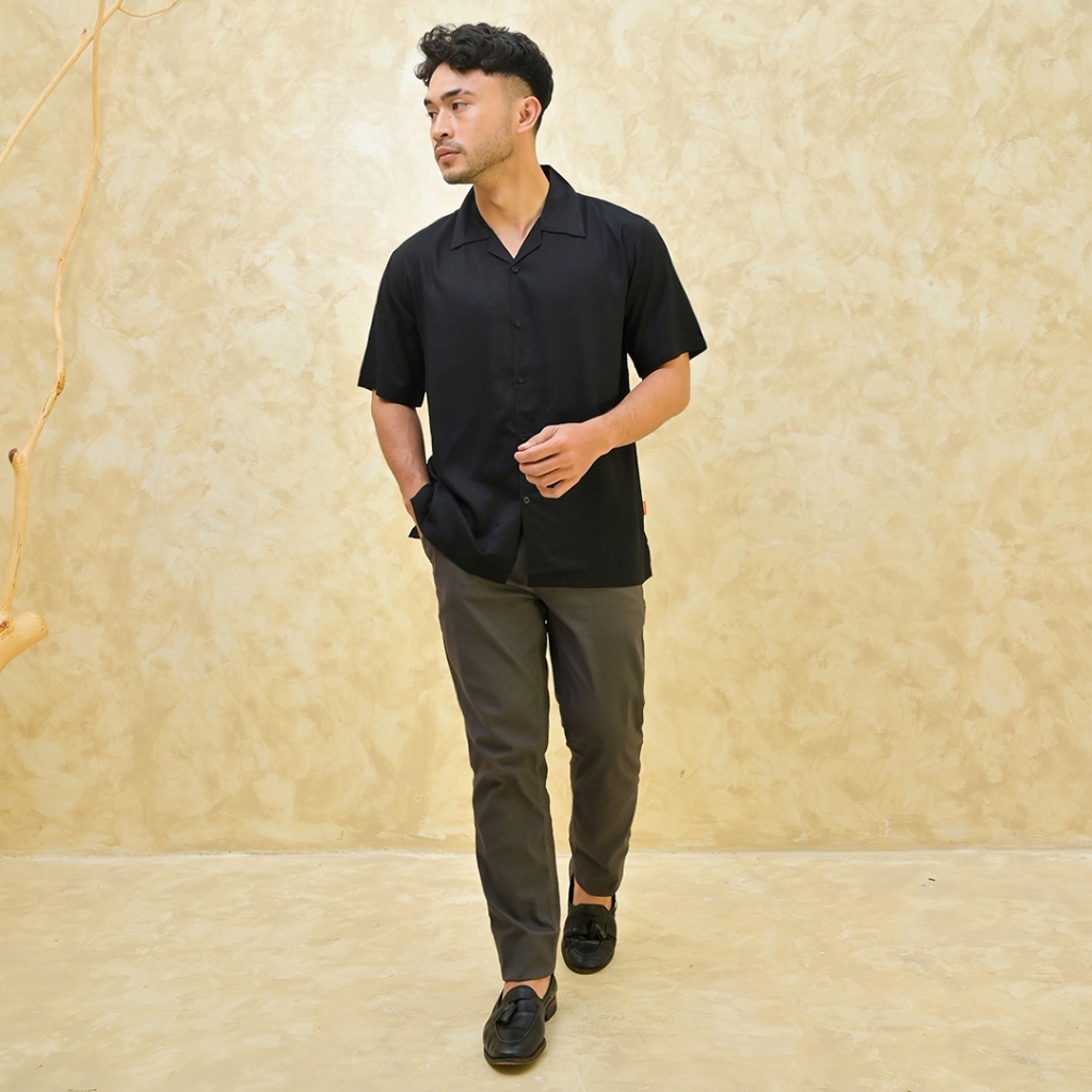 Mickout Solid Casual Shirt - Kemeja Kasual Polos Pria Katun Rayon Relaxed Fit Lengan Pendek - Hitam
