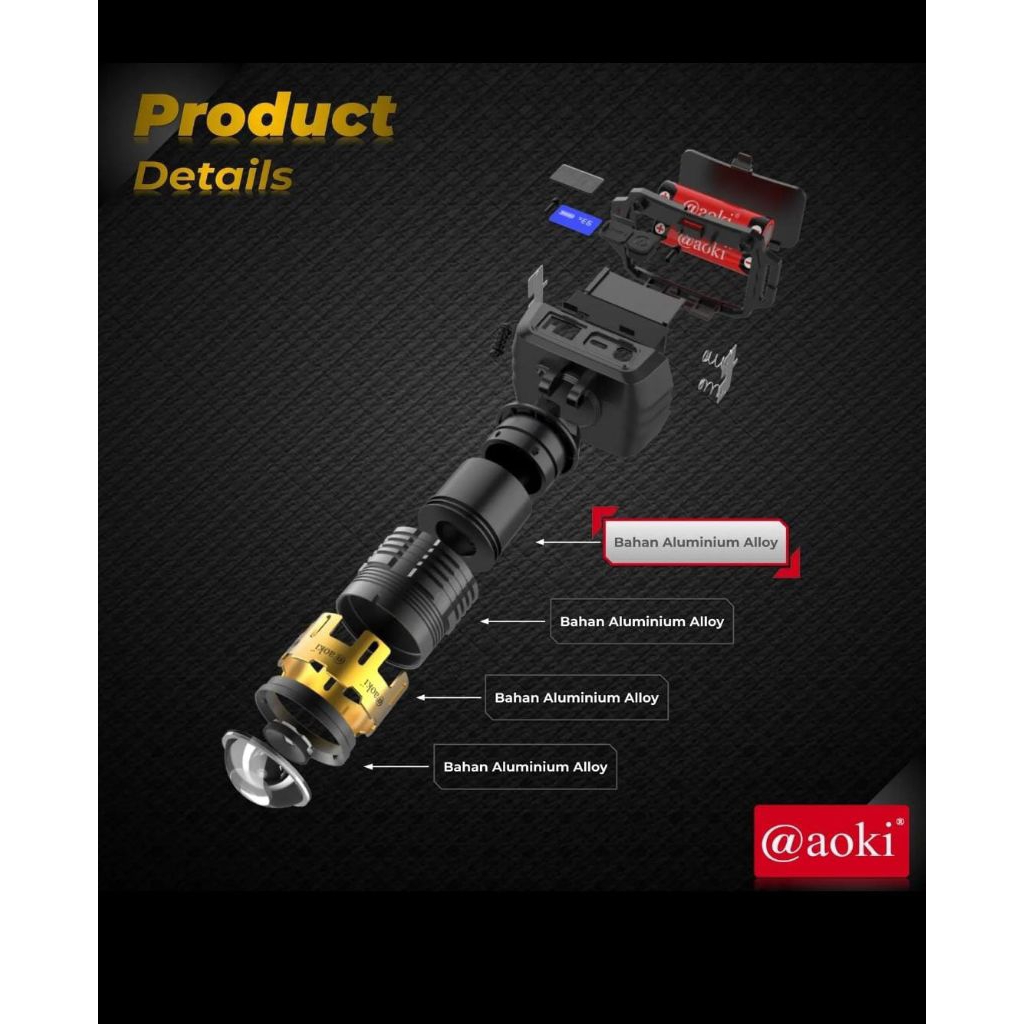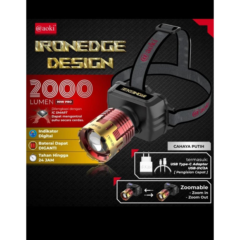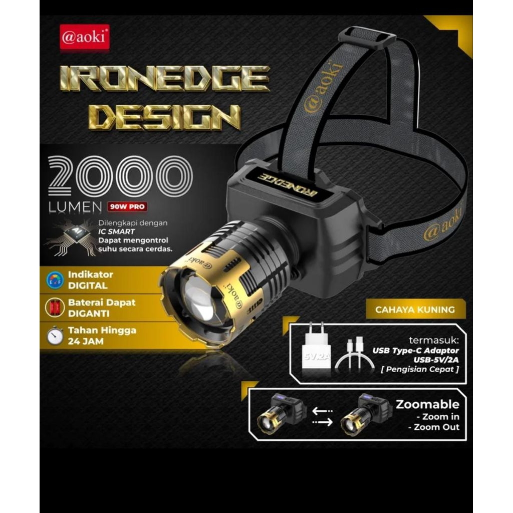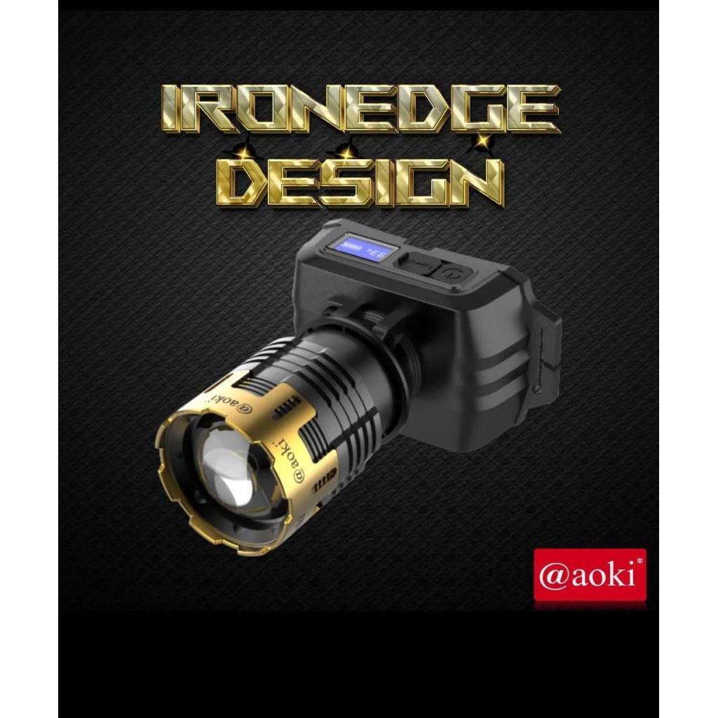 AOKI senter kepala zoom IRONEDGE DESIGN LED LASER PLUS IC SMART pendingin 5 mode cahaya super terang baterai 3000mAh 2 pcs bisa di bongkar pasang charger tipe c terbaru sp