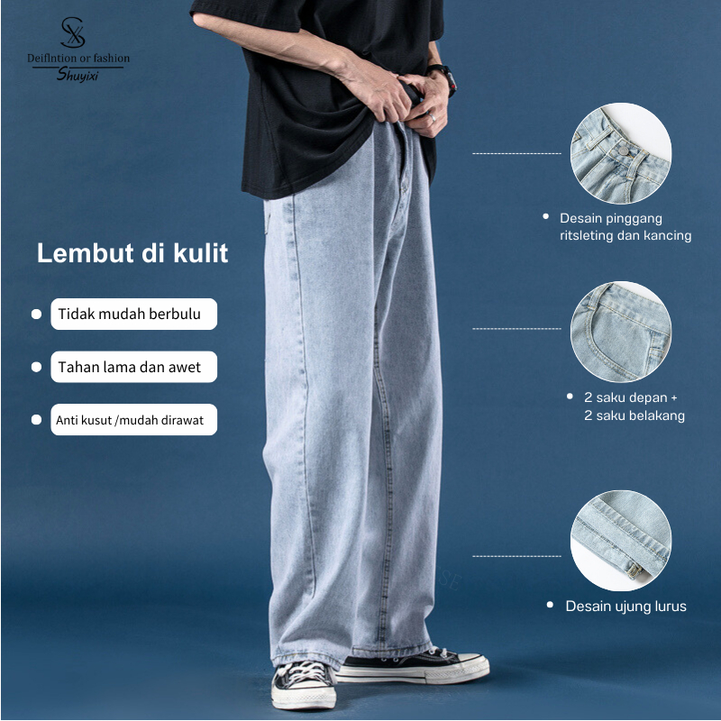 Celana Jeans Pria Biru Muda Longgar Lurus Celana Panjang Lebar Kasual Celana Sederhana