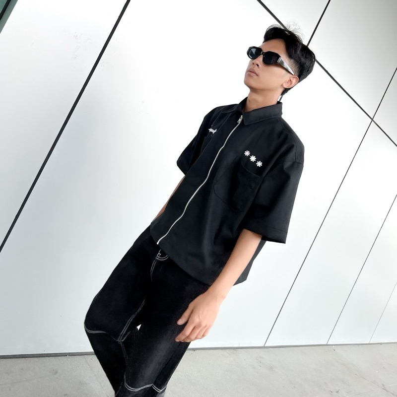 Convergent - Heppni kemeja Boxy Pria Wanita Lengan Pendek Zipper Workshirt Hitam Tebal