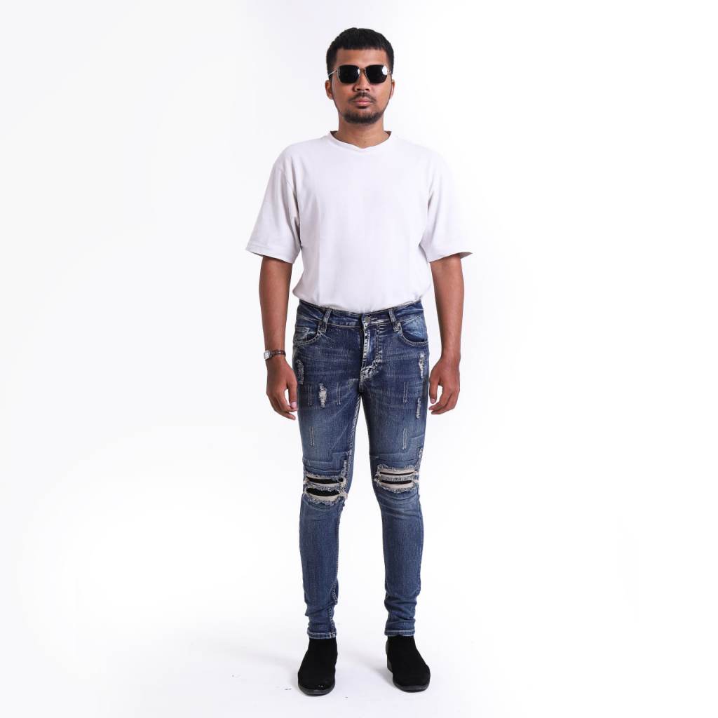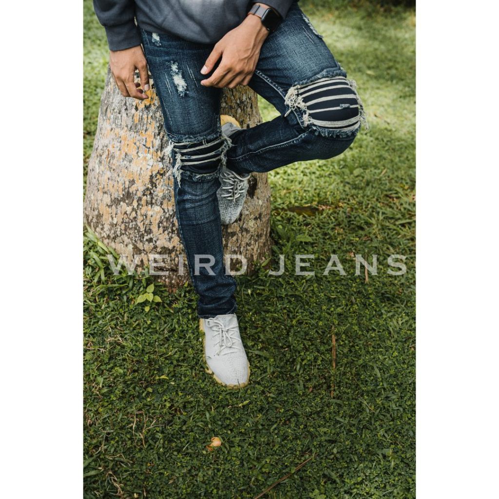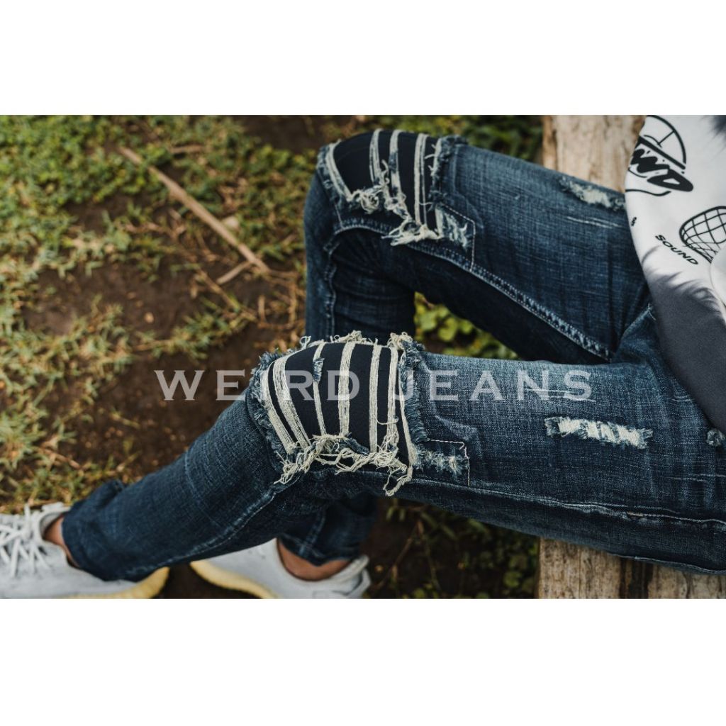 Weird Jeans - Blue Fallen - Celana Panjang Jeans Pria Sobek Tambal Strech Denim