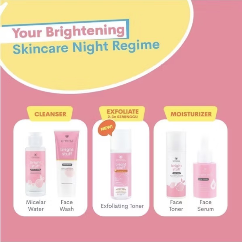 Face Serum 30ml, Cleanser 100ml, Toner 100ml, Tone Up Cream, Moist, Night Cream, Micelar water, Loose Powder, Sheet Mask, Face Wash Acne 100ml, Moist Acne 20ml