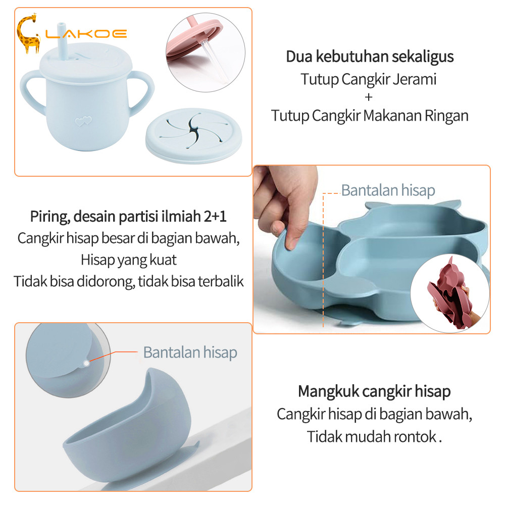 LAKOEOFFICIALMALL 8 in 1 Peralatan Makan Silikon Bayi Tempat Makan Bayi Silicone Set Mangkok Piring Sendok Garpu Bib Cup Newborn Gift Set